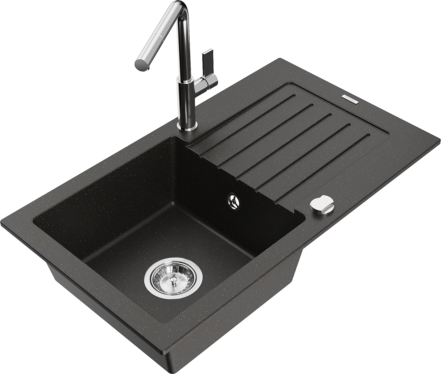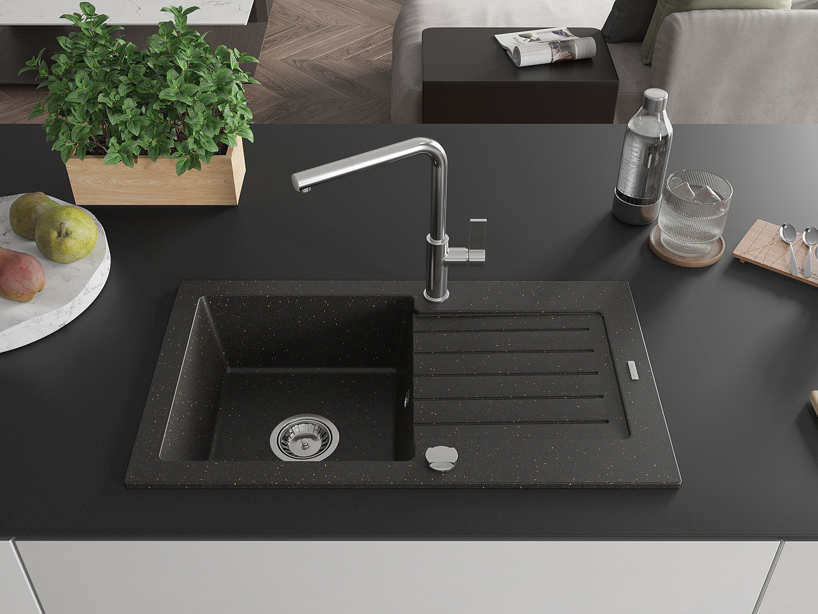 Mexen Pablo granitový drez s 1-komorou a odkvapkávacou doskou a kuchynskou batériou Flora, čierny/zlatý metalický