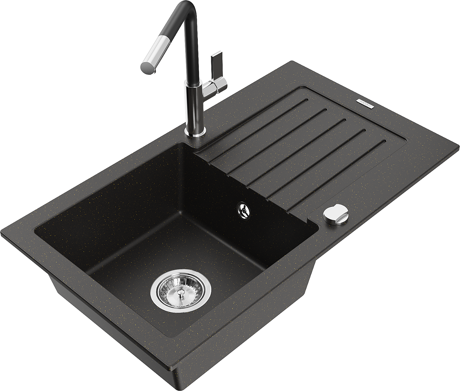 Mexen Pablo žulový kuchynský drez s odkvapkávačom a kuchynskou batériou Flora, čierny/zlatý metalický - 6510-75-670401-07