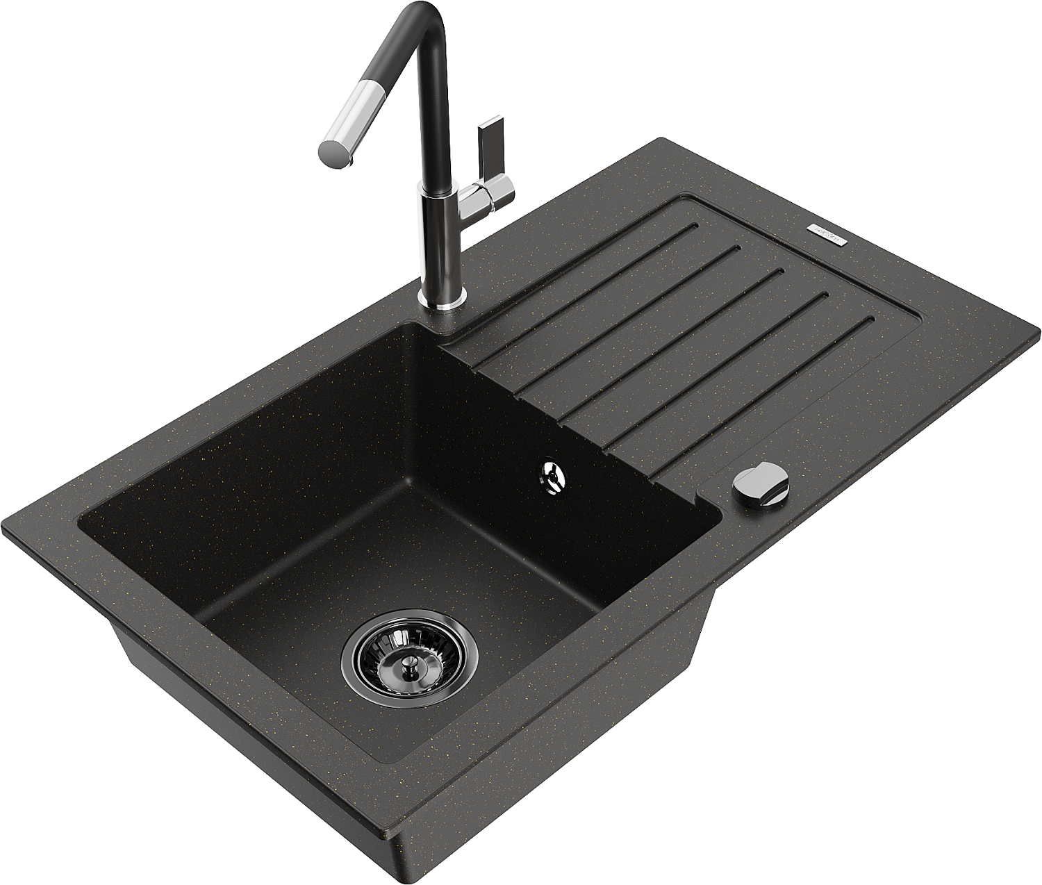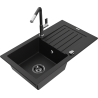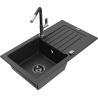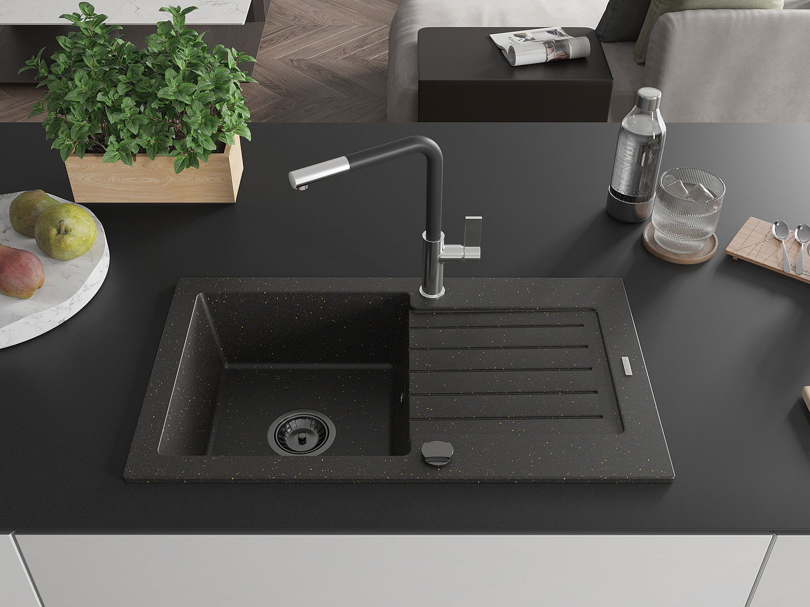Mexen Pablo žulový drez s 1 komorou s odkvapom a kuchynskou batériou Flora, čierny/zlatý metalik - 6510-75-670401-07-B