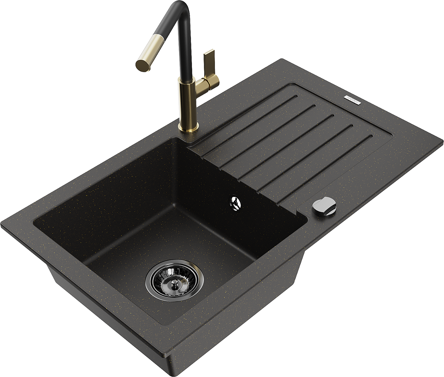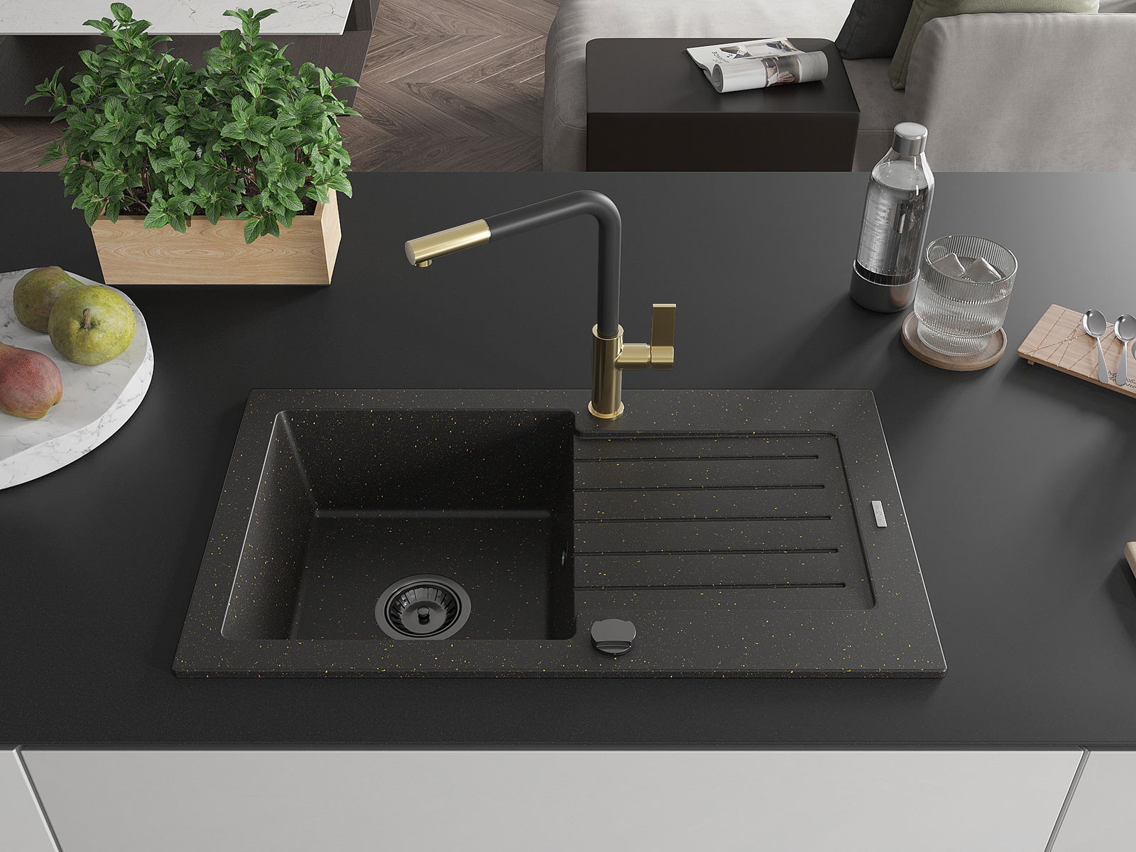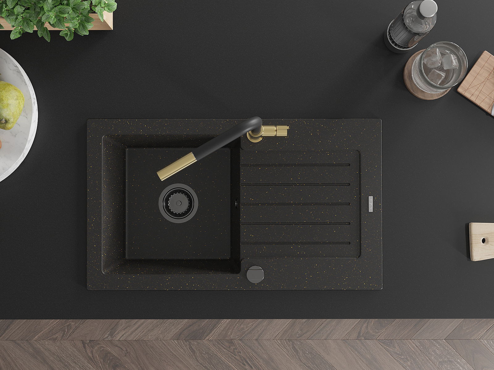 Mexen Pablo granitový drez s 1 komorou, odkvapkávacou plochou a kuchynskou batériou Flora, čierny/zlatý metalik
