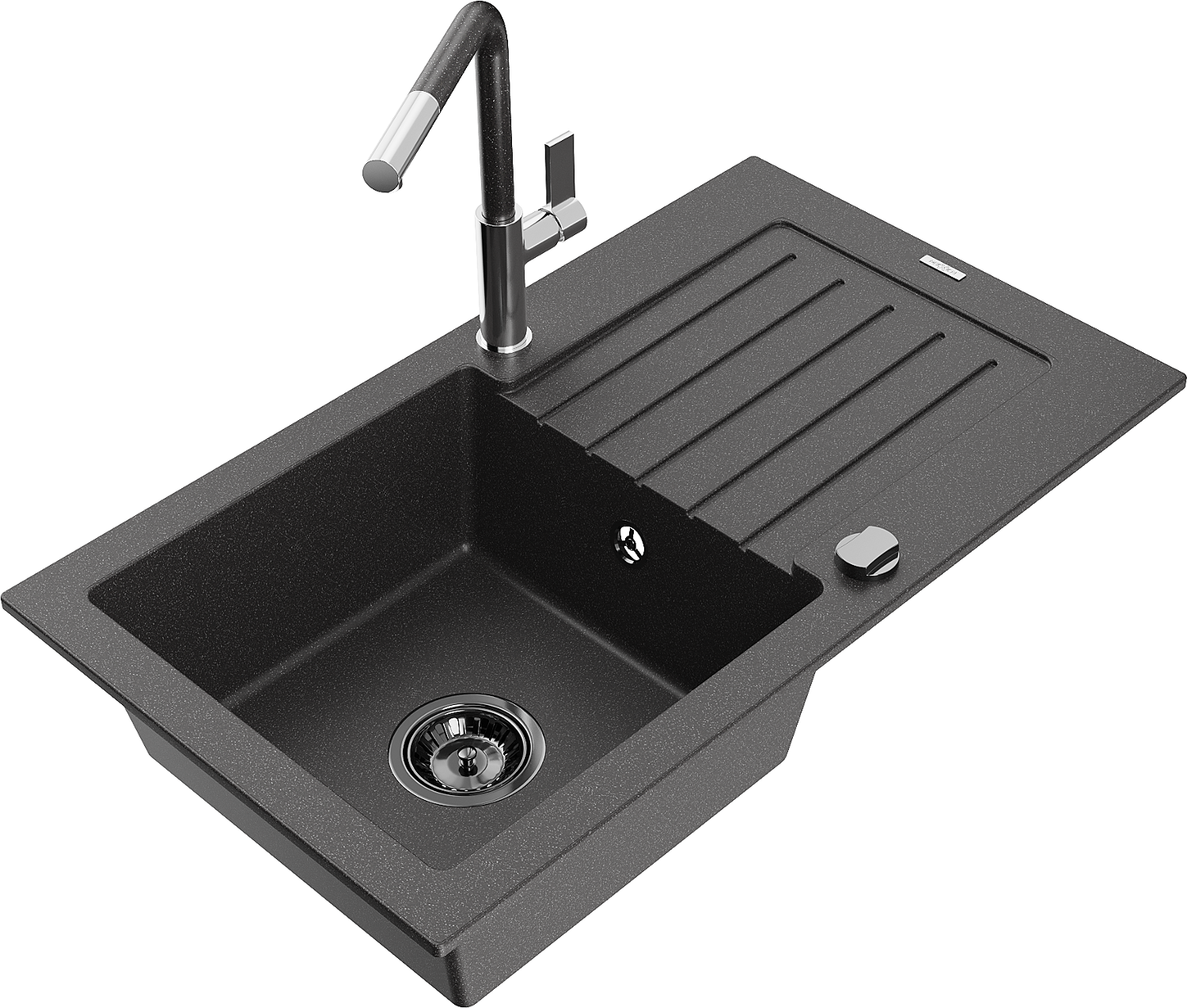 Mexen Pablo granitový drez s 1 komorou, odkvapkávačom a kuchynskou batériou Flora, čierny s bodkami - 6510-76-670401-08-B