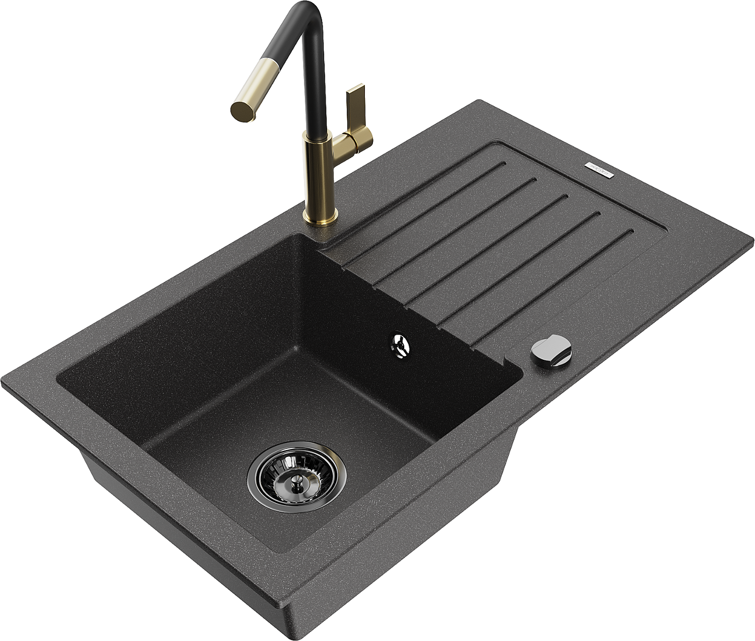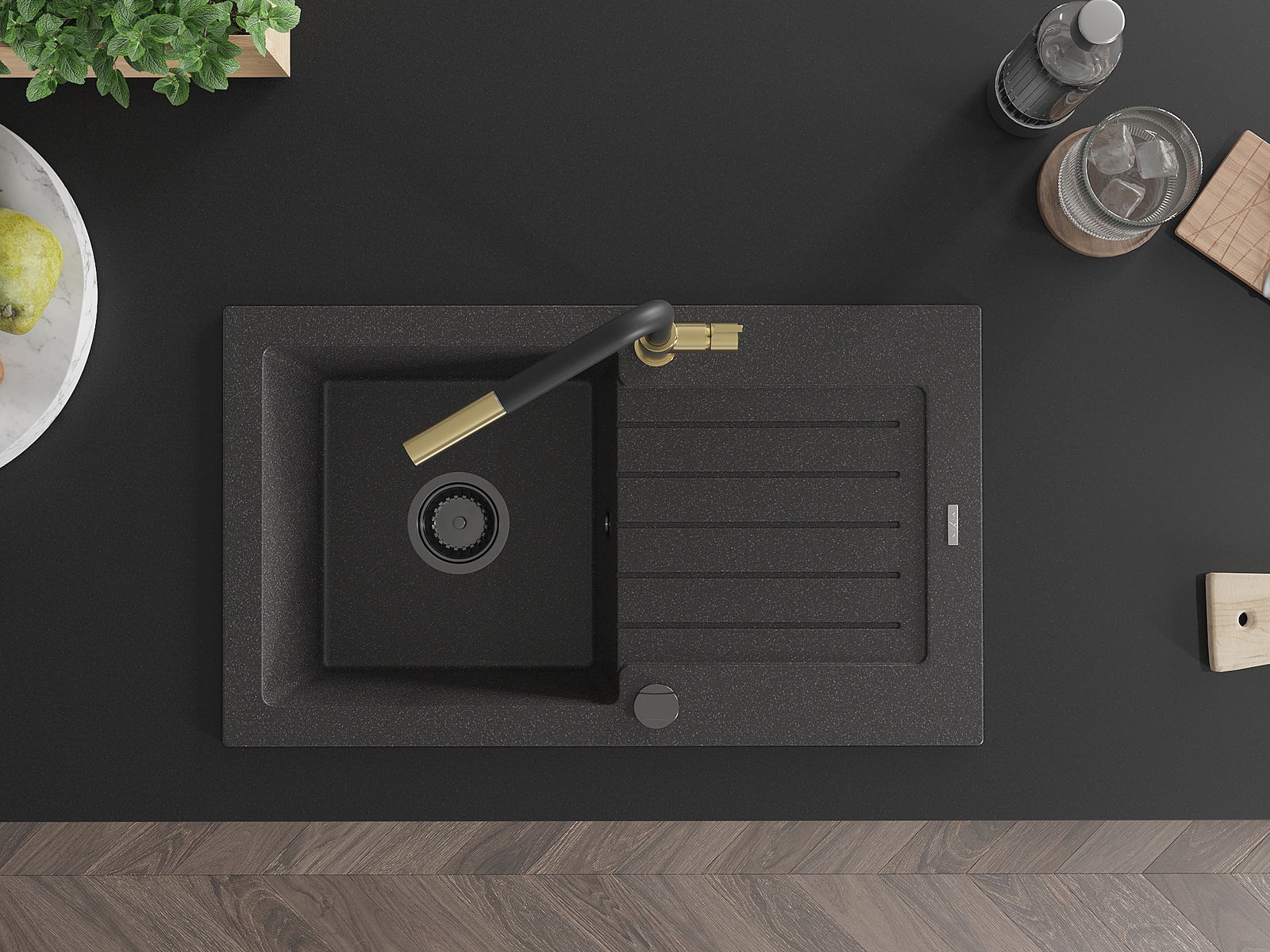 Mexen Pablo žulový drez 1-komorový s odkvapkávačom a kuchynská batéria Flora, čierno bodkovaná - 6510-76-670401-57-B