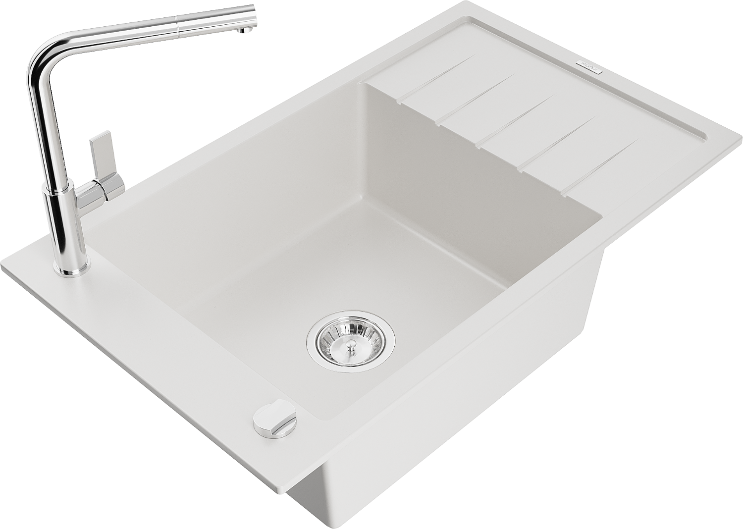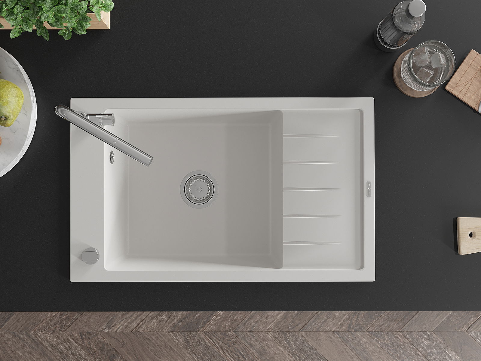 Mexen Elias 1-komorový žulový drez s odkvapkávačom a kuchynskou batériou Flora, biely - 6511-20-670401-00