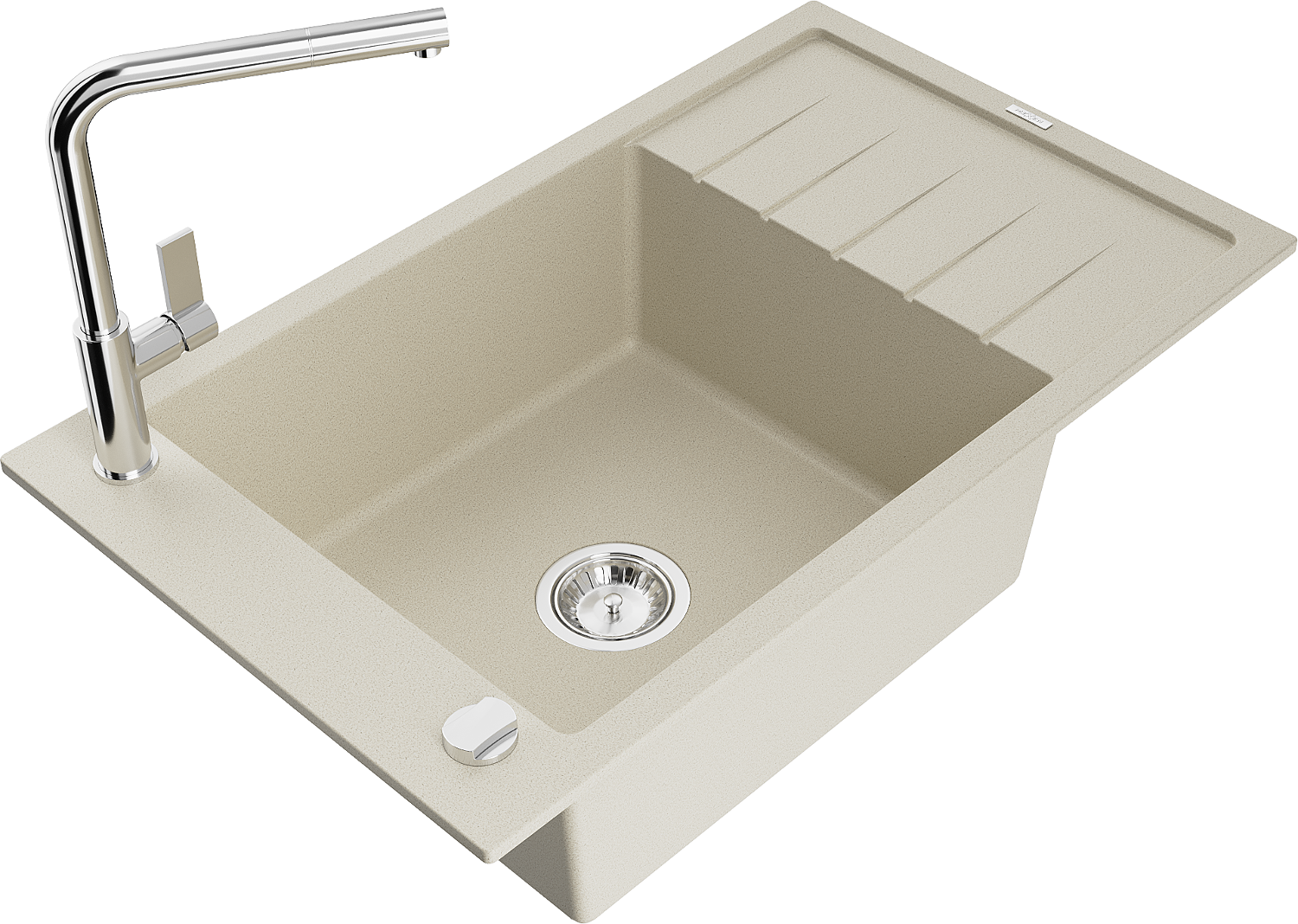 Mexen Elias žulový kuchynský drez s 1 komorou s odkvapkávačom a kuchynskou batériou Flora, béžový - 6511-69-670401-00