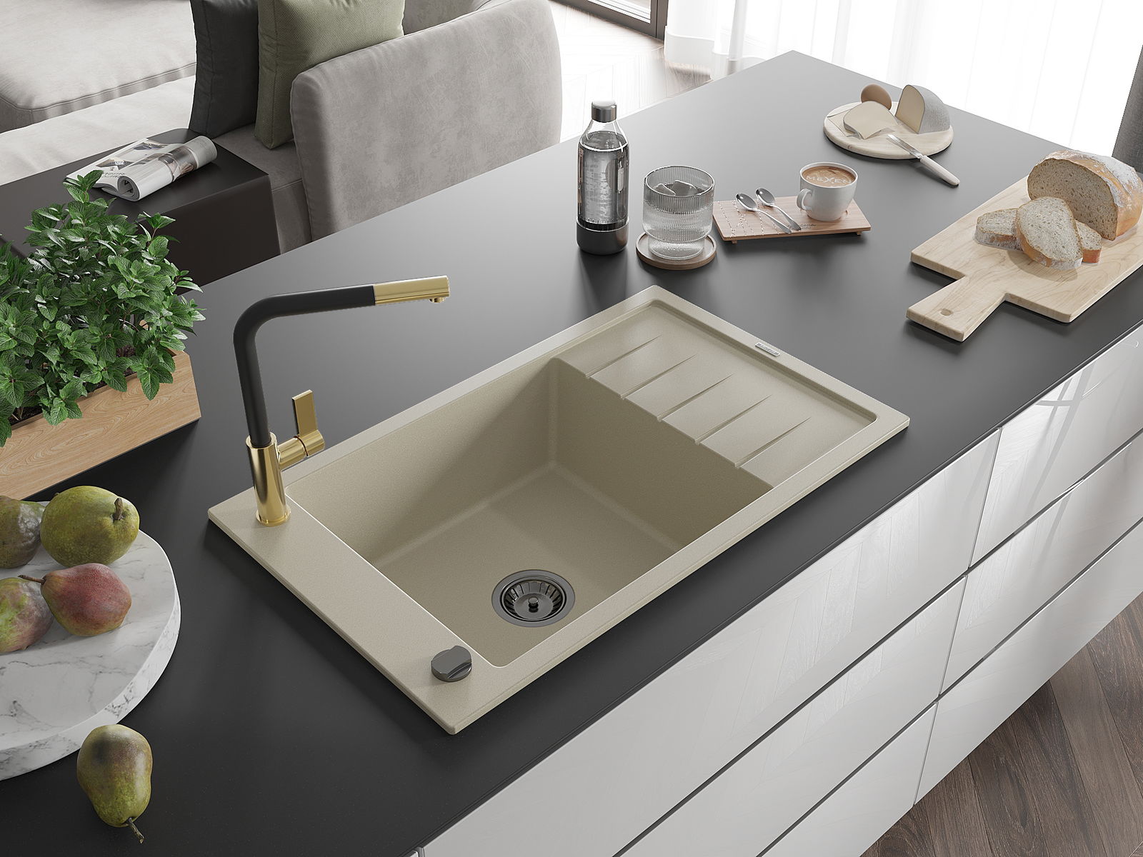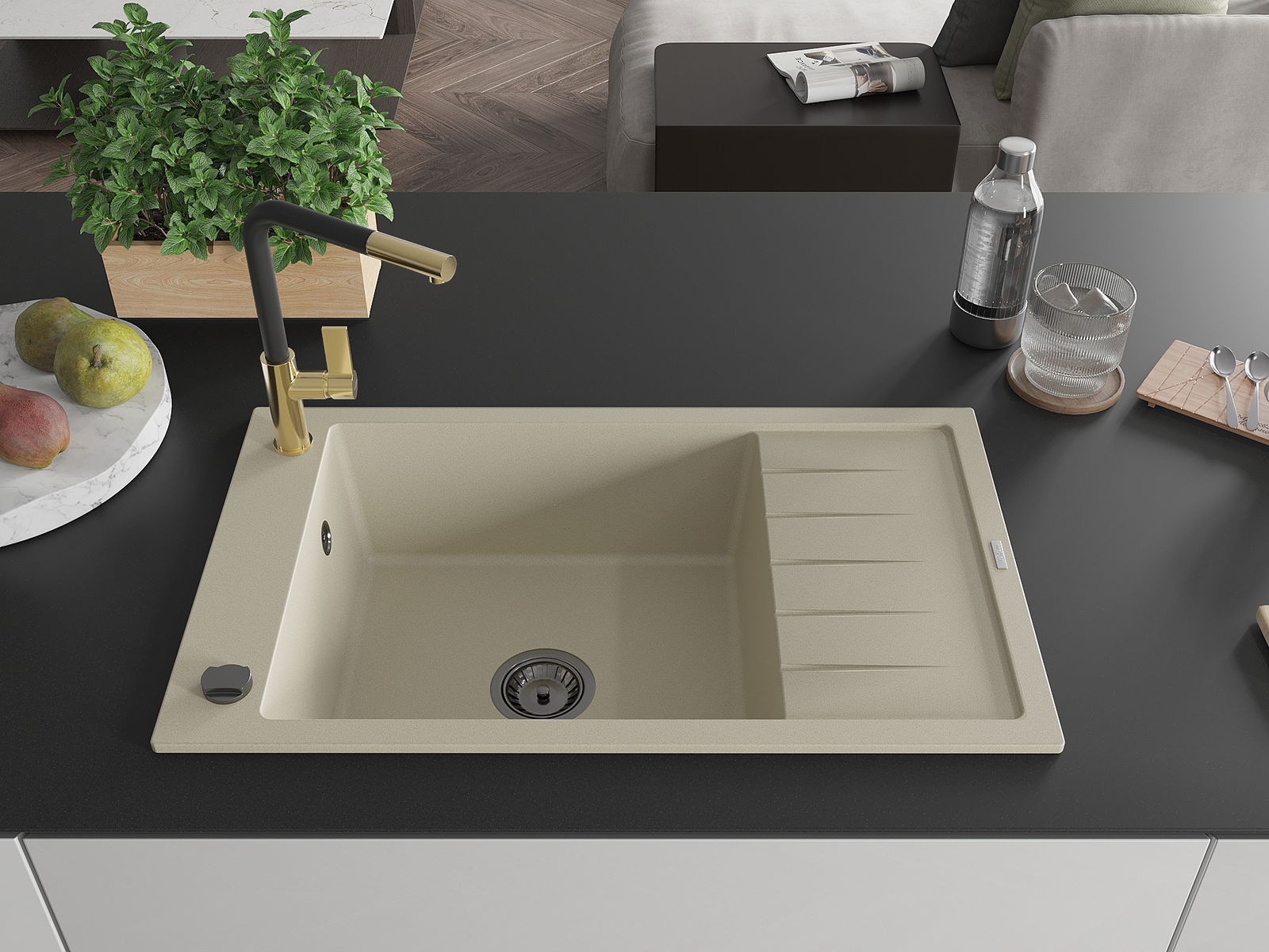 Povrch umývadla je odolný voči škvrnám a sfarbeniu, vďaka čomu sa ľahko čistí a zachováva si svoju farbu po dlhú dobu. Estetický a prakticky dopĺňajúci každú kuchyňu.