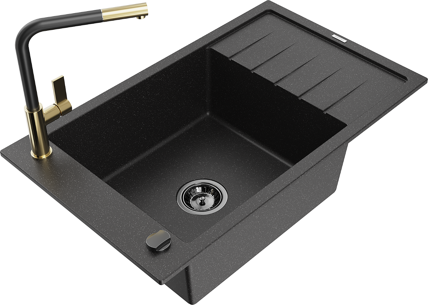 Mexen Elias granitový drez s 1 komorou s odkvapkávačom a kuchynskou batériou Flora, čierny/strieborný metalický