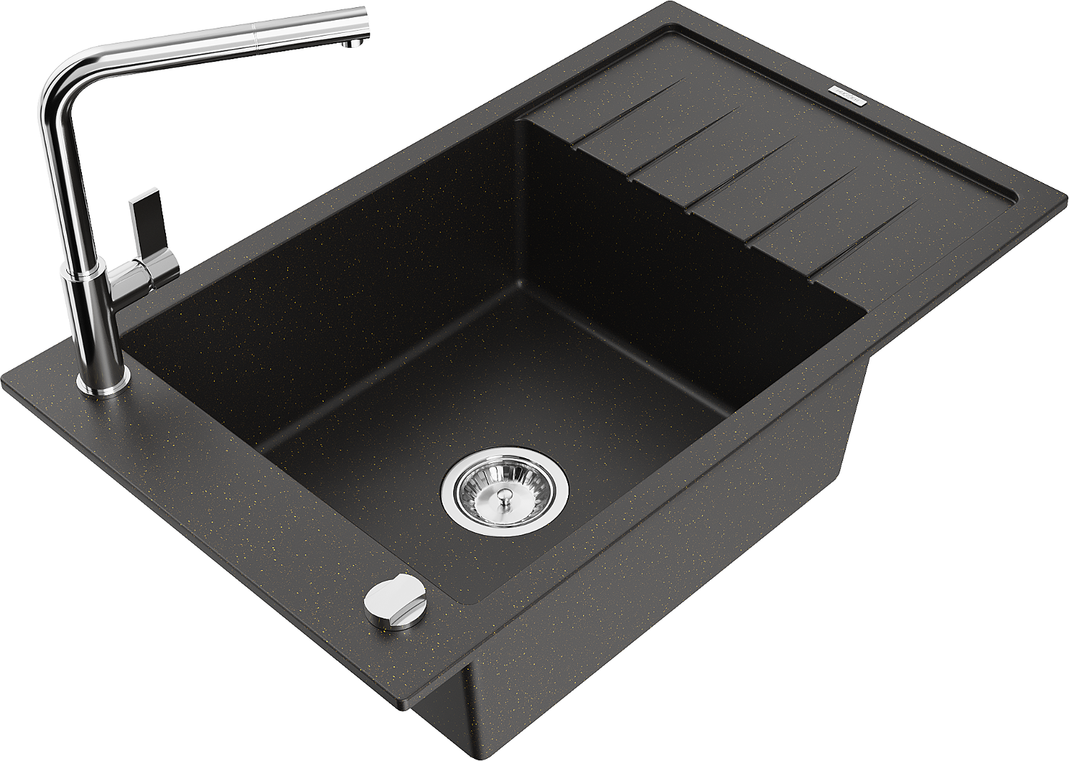 Mexen Elias žulový drez 1-komorový s odkvapkávačom a kuchynskou batériou Flora, čierny/zlatý metalik - 6511-75-670401-00