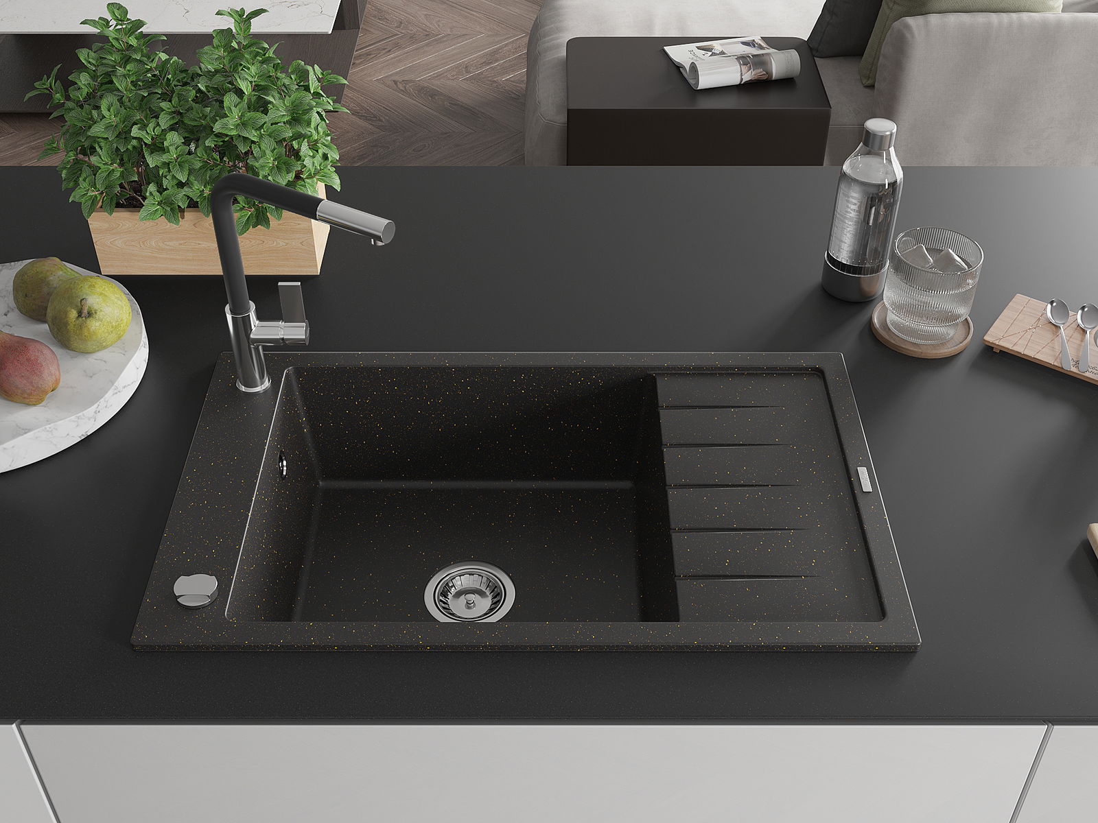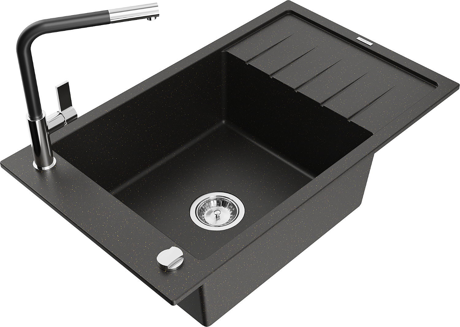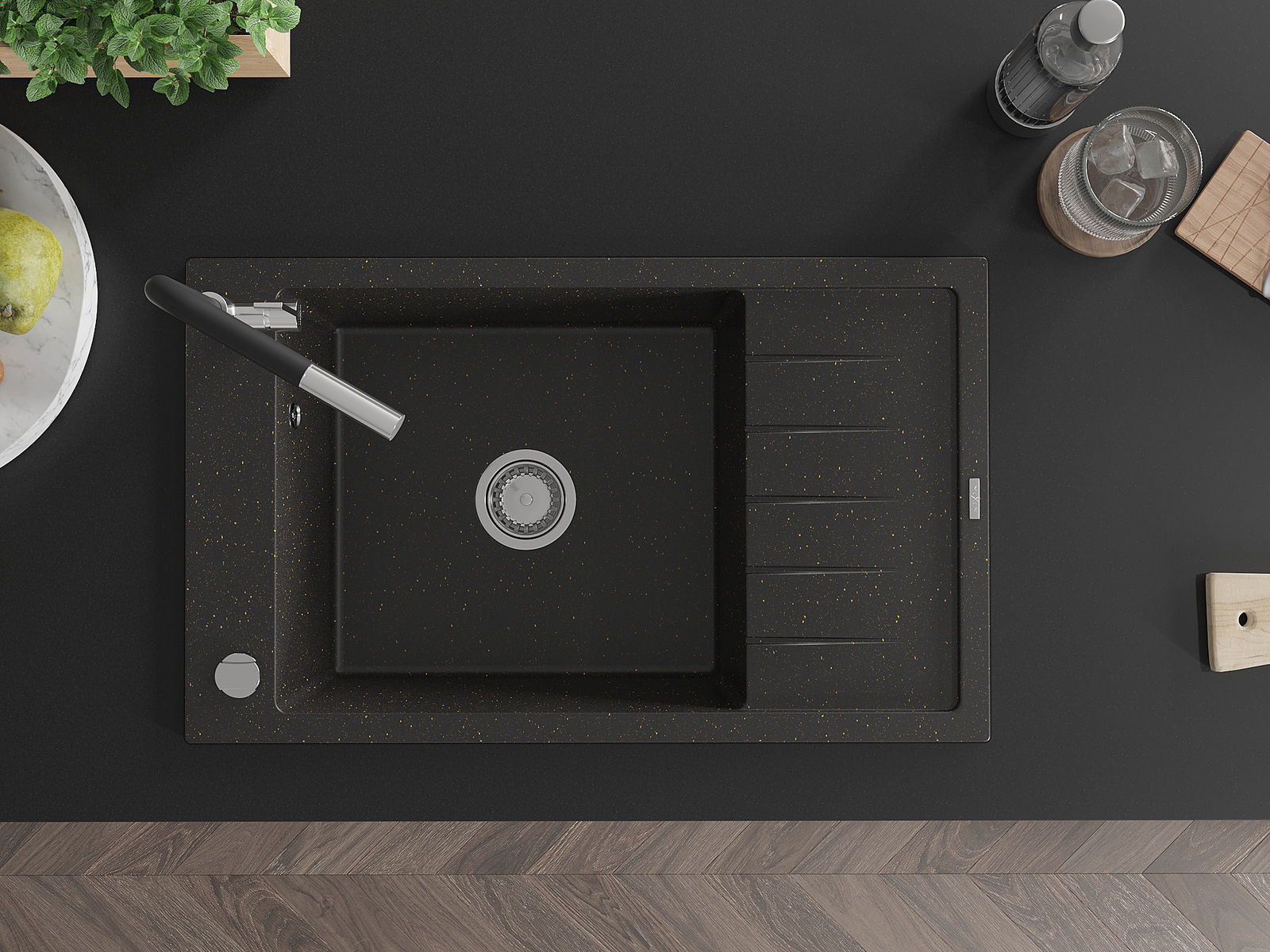 Mexen Elias granitový jednodrez s odkvapkávačom a kuchynskou batériou Flora, čierny/zlatý metalický - 6511-75-670401-07