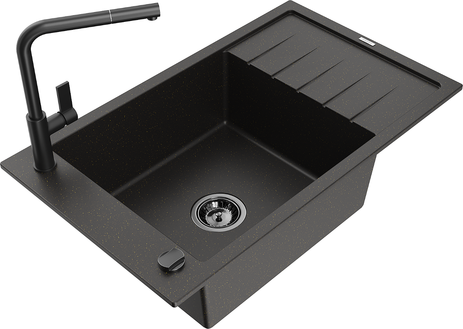 Mexen Elias granitový drez 1-komorový s odkvapkávačom a kuchynskou batériou Flora, čierny/zlatý metalik - 6511-75-670401-70-B
