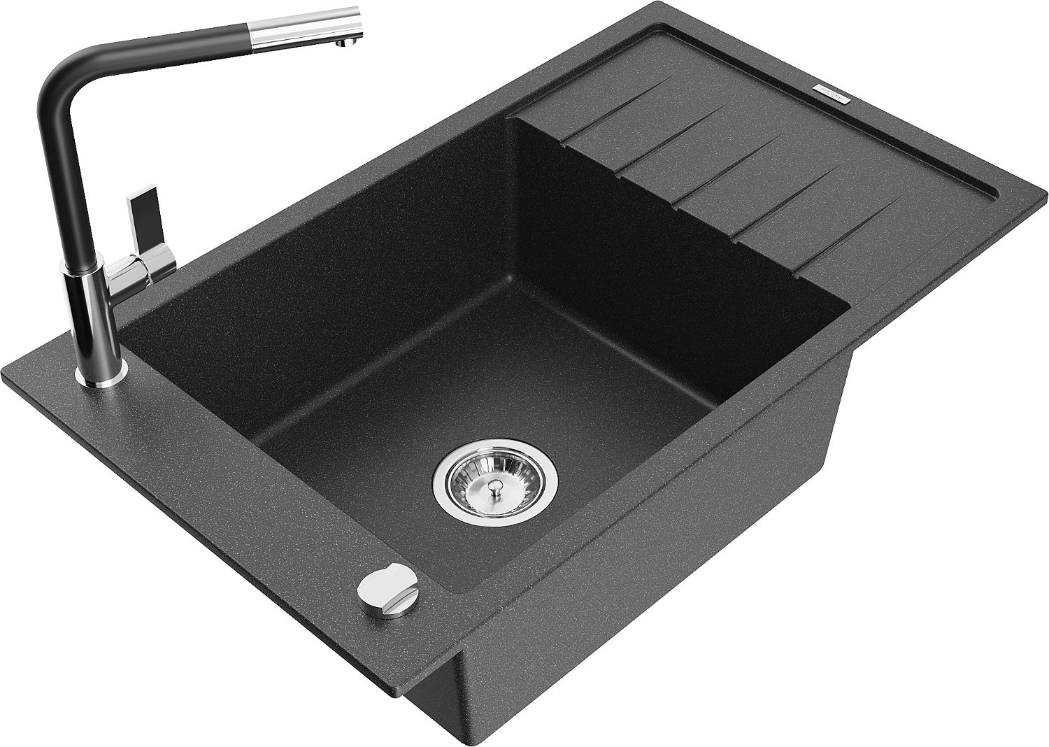 Mexen Elias granitový drez s jednou komorou s odkvapkávačom a kuchynskou batériou Flora, čierny s bodkami