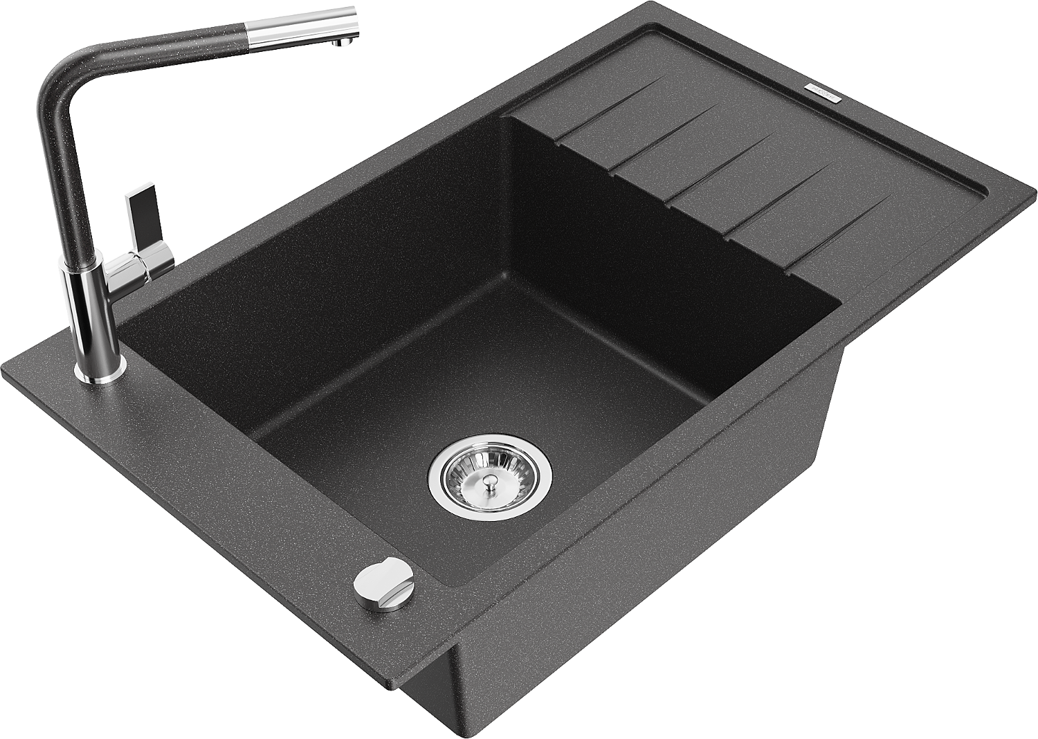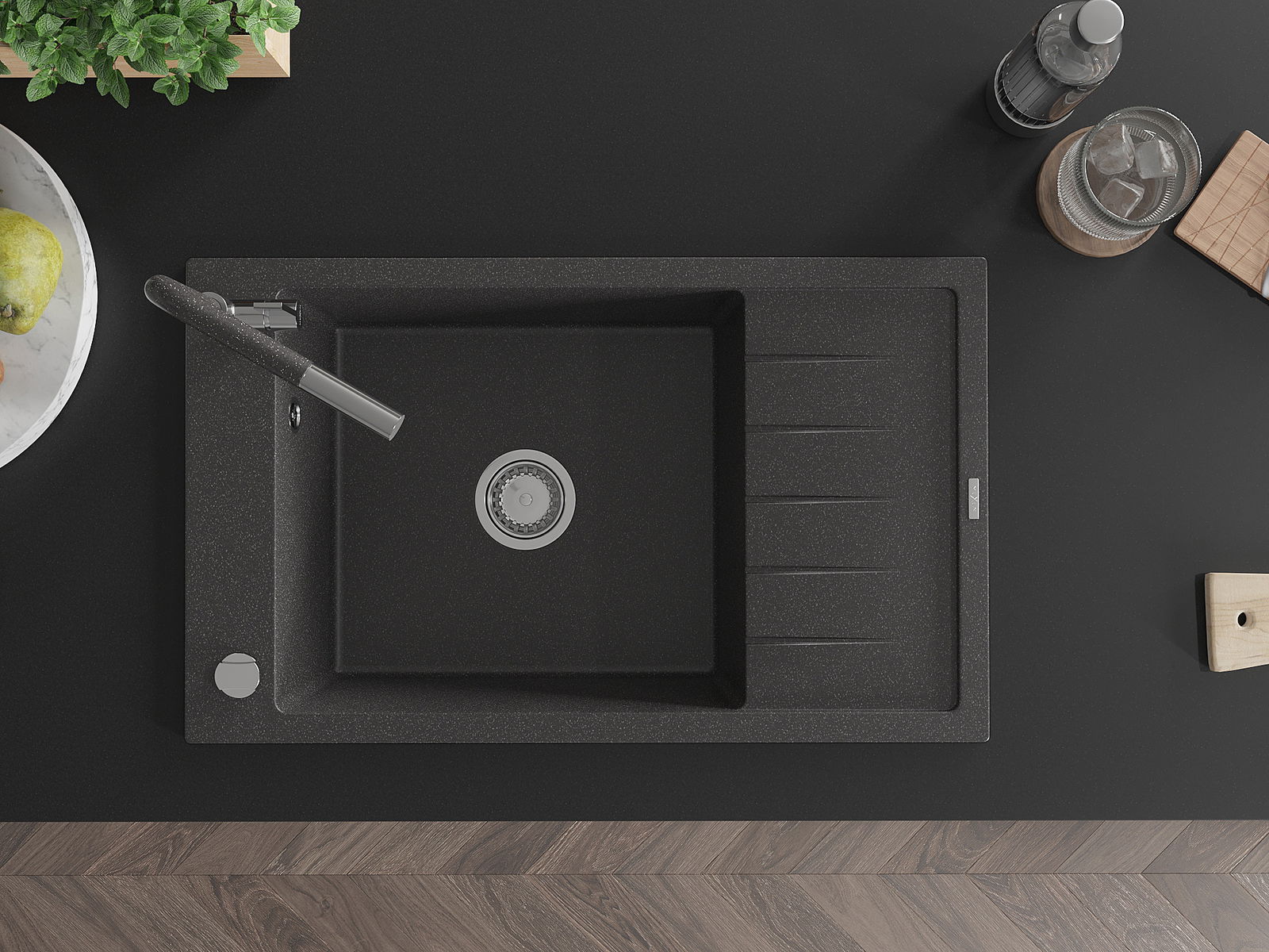 Mexen Elias jednokomorový granitový drez s odkvapkávačom a kuchynskou batériou Flora, čierny škvrnitý - 6511-76-670401-08
