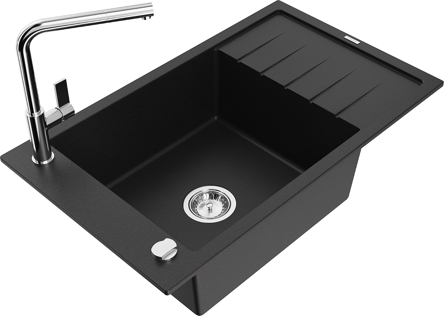 Mexen Elias žulový drez 1-komorový s odkvapkávačom a kuchynskou batériou Flora, čierny - 6511-77-670401-00