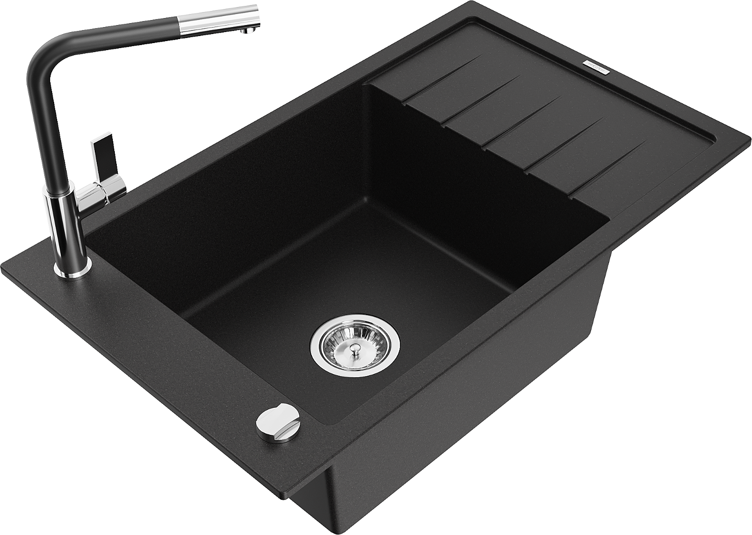 Mexen Elias žulový drez s 1 komorou s odkvapkávačom a kuchynskou batériou Flora, čierny - 6511-77-670401-07