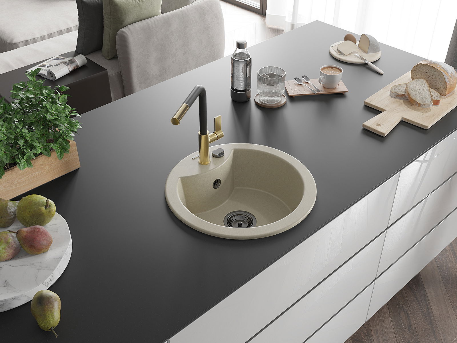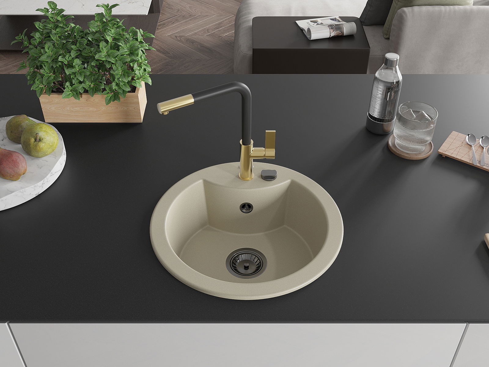 Drez má predfrézovaný otvor s priemerom 35 mm na samostatné prerazenie. Môže sa využiť napríklad na montáž dávkovača na tekutinu, ktorý eliminuje prítomnosť plastových fliaš v kuchyni a pridáva jej elegantné dokončenie.