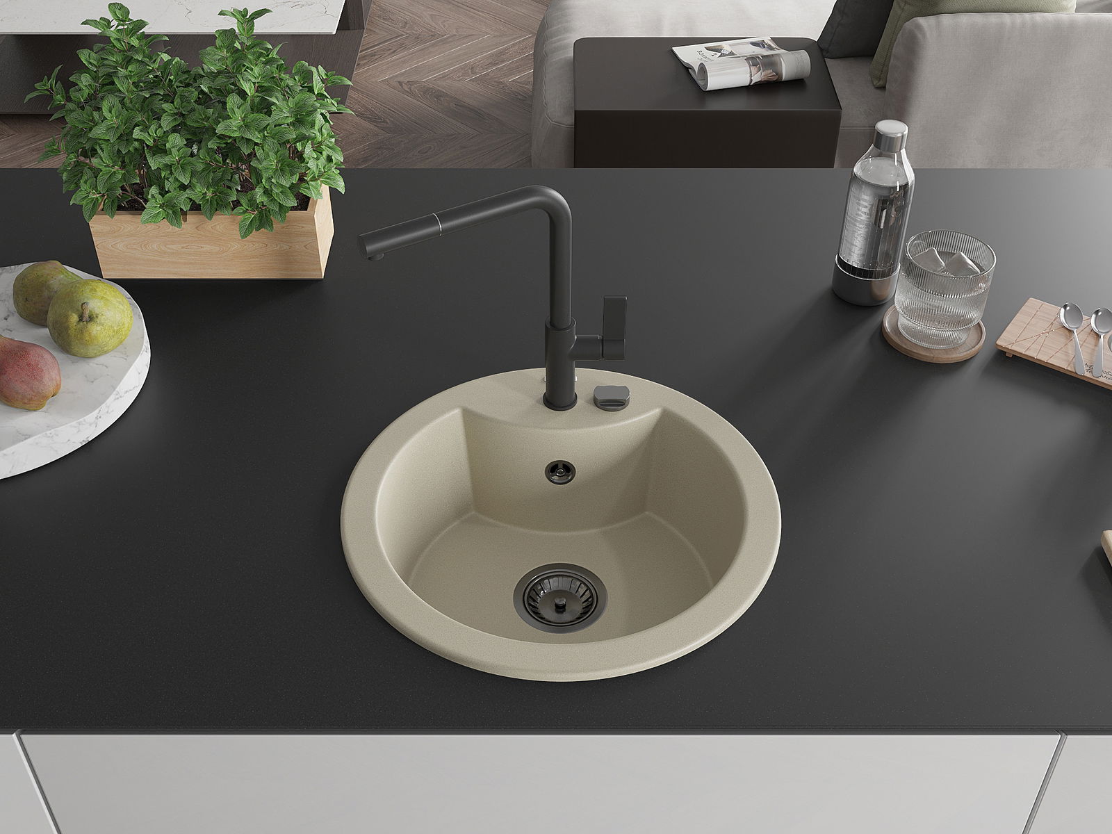 Povrch umývadla je odolný voči škvrnám a sfarbeniu, vďaka čomu sa ľahko čistí a zachováva si svoju farbu po dlhú dobu. Estetický a prakticky dopĺňajúci každú kuchyňu.