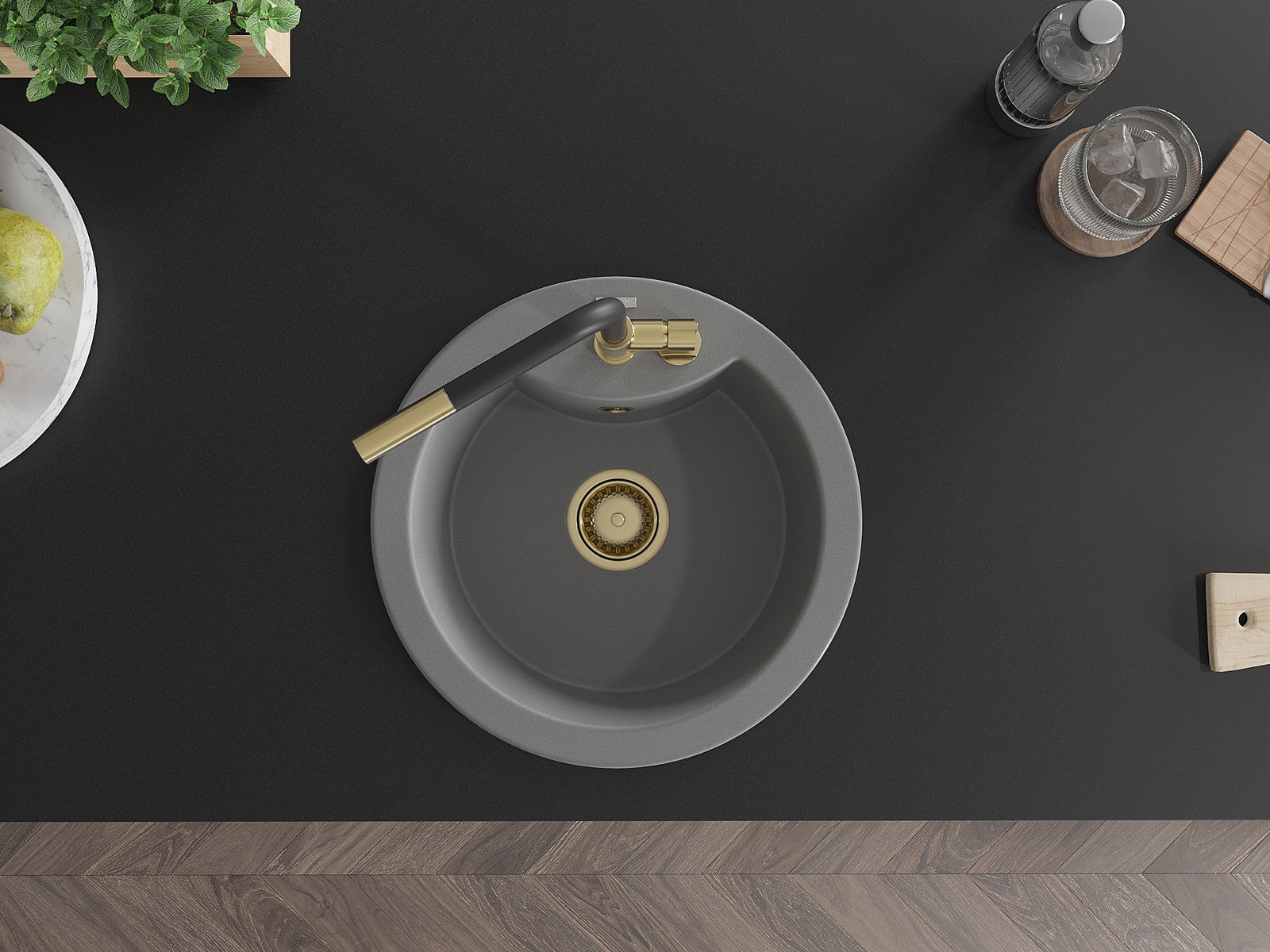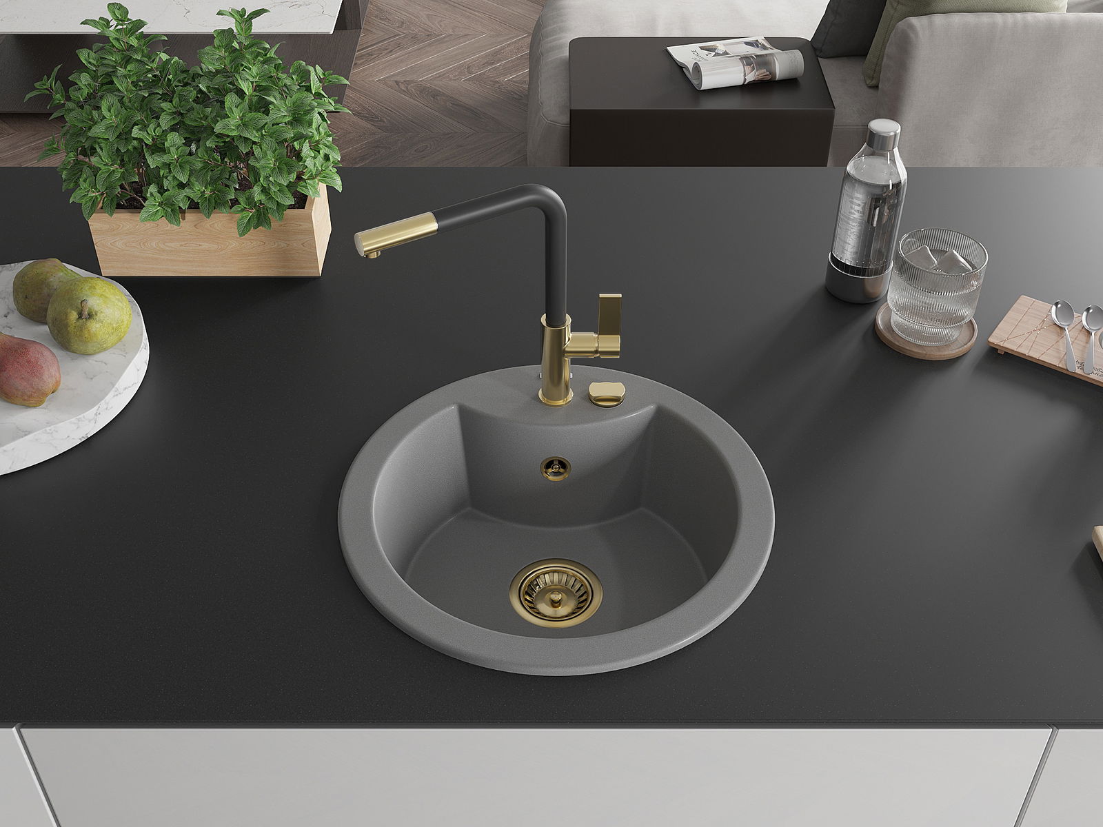 Mexen Diego žulový kuchynský drez s jednou komorou a kuchynskou batériou Flora, sivý - 6512-71-670401-57-G