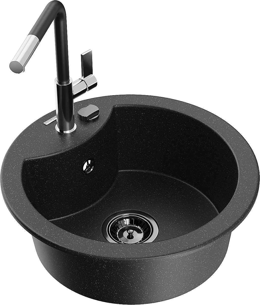 Mexen Diego jednokomorový drez z granitu s kuchynskou batériou Flora, čierny/strieborný metalický - 6512-73-670401-07-B