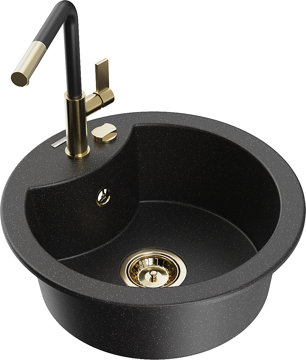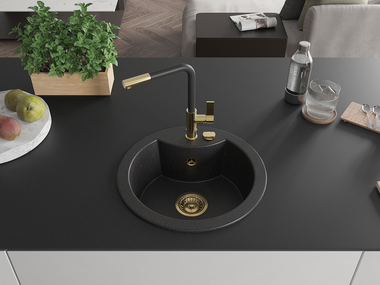 Mexen Diego žulový drez s 1 komorou s kuchynskou batériou Flora, čierny/strieborný metalický - 6512-73-670401-57-G
