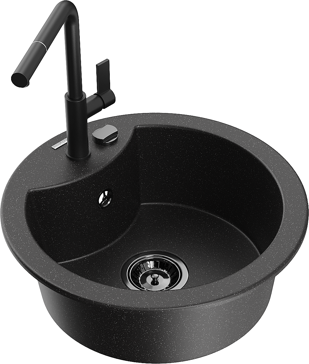 Mexen Diego granitový drez 1-komorový s kuchynskou batériou Flora, čierny/strieborný metalik - 6512-73-670401-70-B