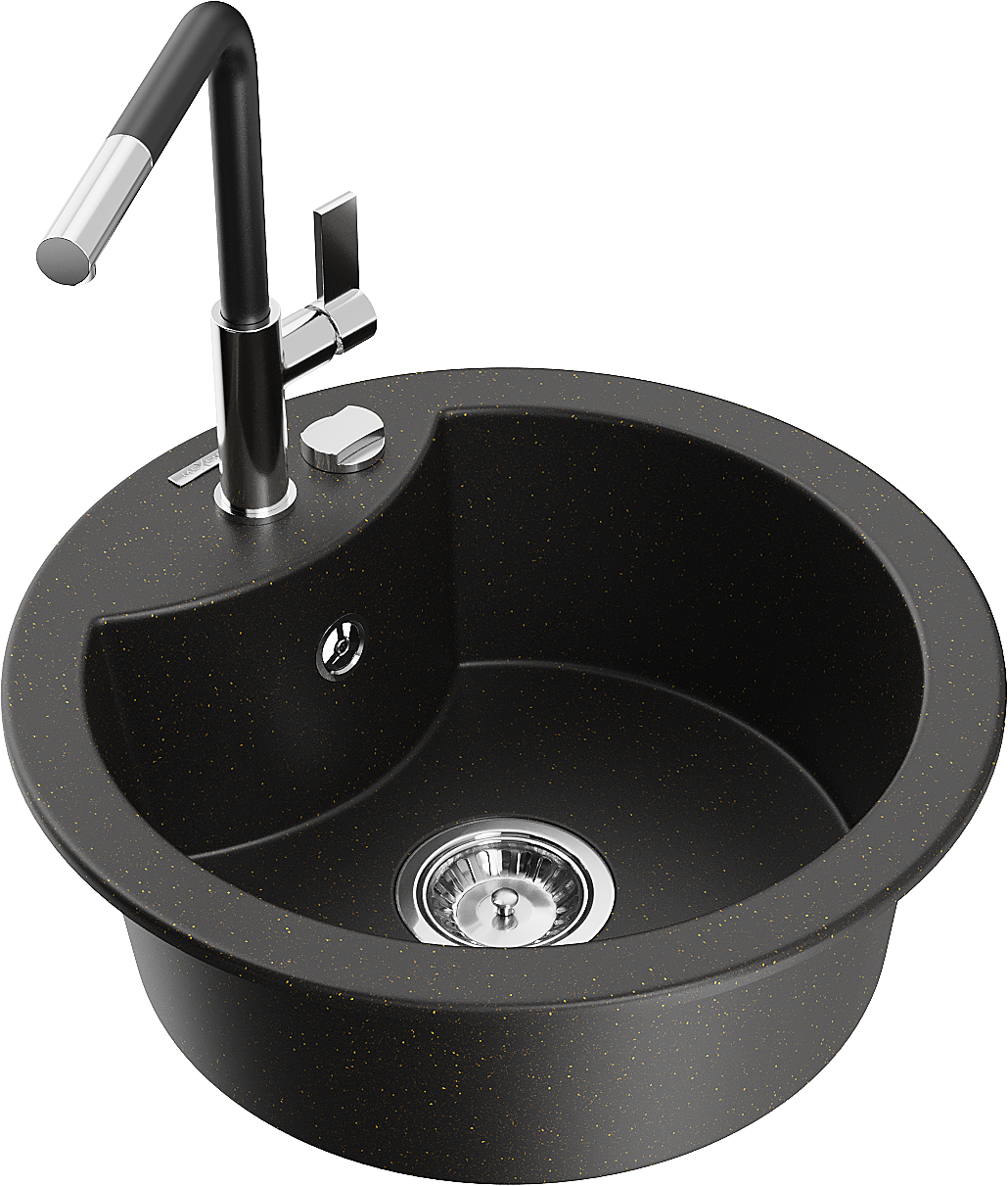 Mexen Diego žulový kuchynský drez s 1 komorou s kuchynskou batériou Flora, čierny/zlatý metalický - 6512-75-670401-07