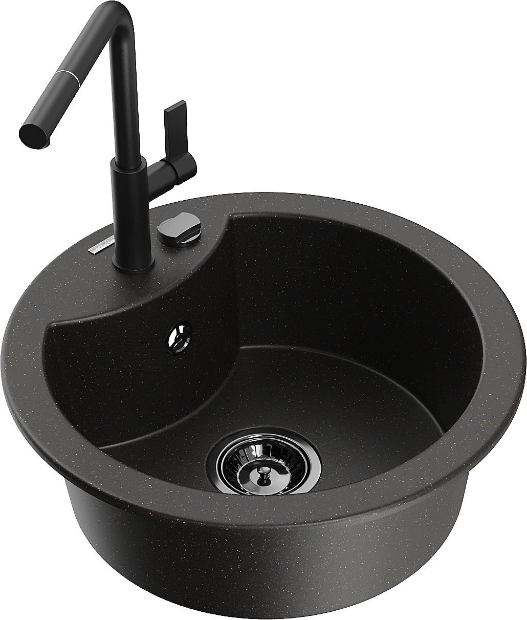 Mexen Diego granitový drez 1-komorový s kuchynskou batériou Flora, čierny/zlatý metalik - 6512-75-670401-70-B