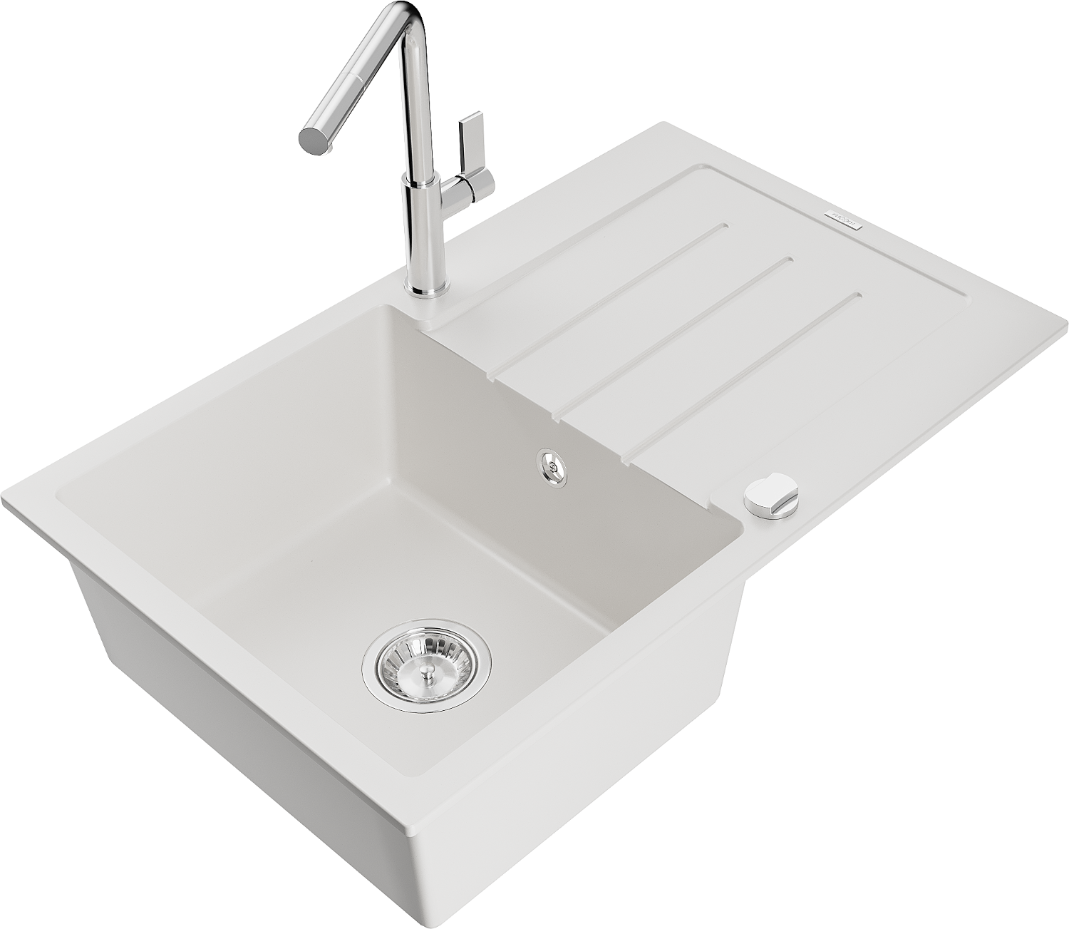 Mexen Bruno granitový drez 1-komorový s odkvapkávačom a kuchynskou batériou Flora, biely - 6513-20-670401-00