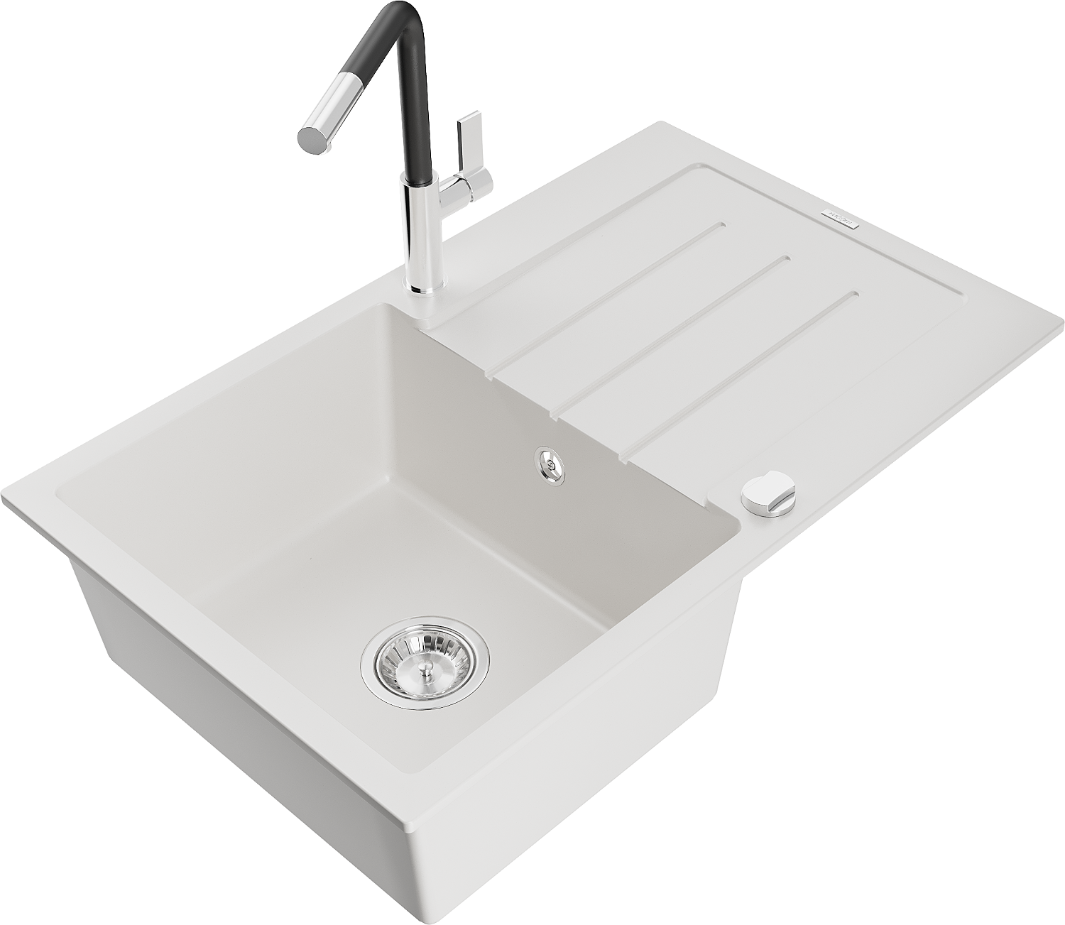 Mexen Bruno žulový drez s 1 komorou a odkvapkávačom a kuchynská batéria Flora, biela - 6513-20-670401-07