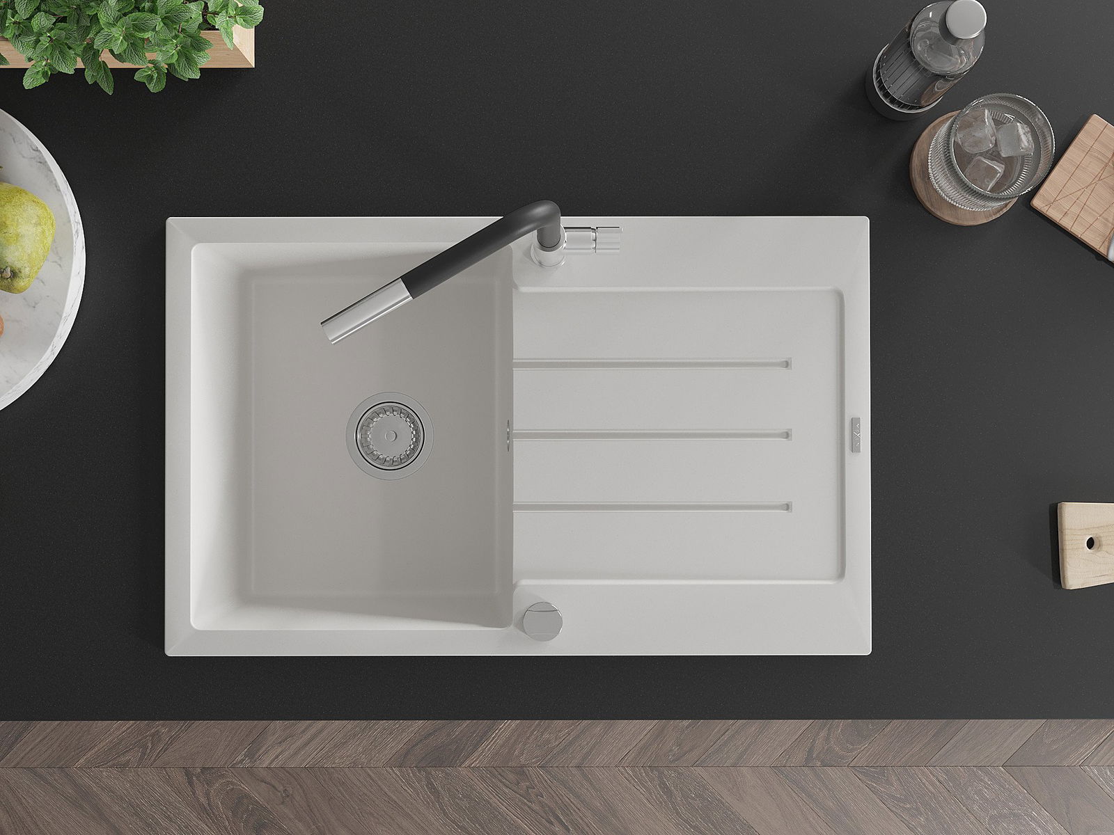 Povrch umývadla je odolný voči škvrnám a sfarbeniu, vďaka čomu sa ľahko čistí a zachováva si svoju farbu po dlhú dobu. Estetický a prakticky dopĺňajúci každú kuchyňu.