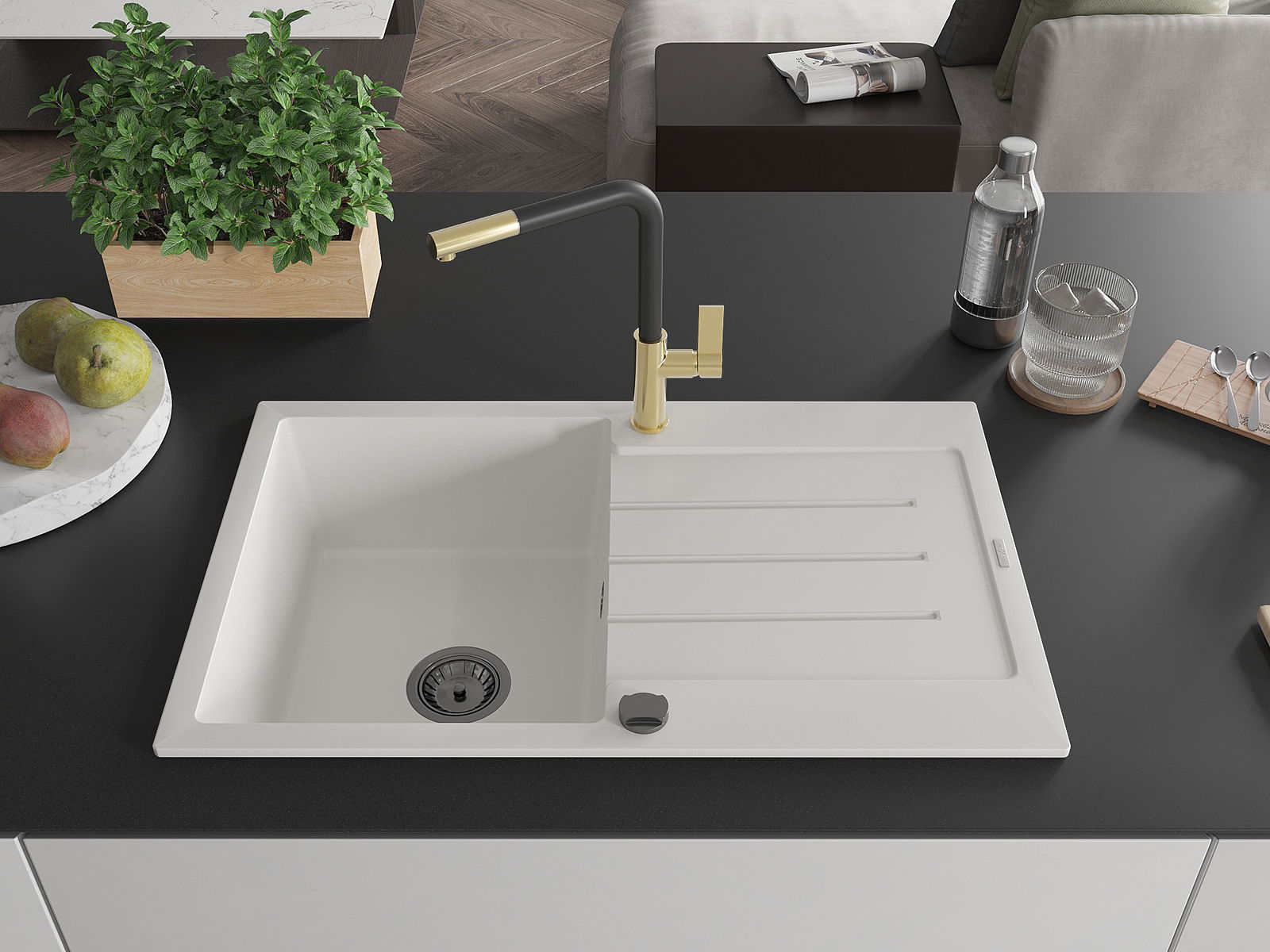 Povrch umývadla je odolný voči škvrnám a sfarbeniu, vďaka čomu sa ľahko čistí a zachováva si svoju farbu po dlhú dobu. Estetický a prakticky dopĺňajúci každú kuchyňu.