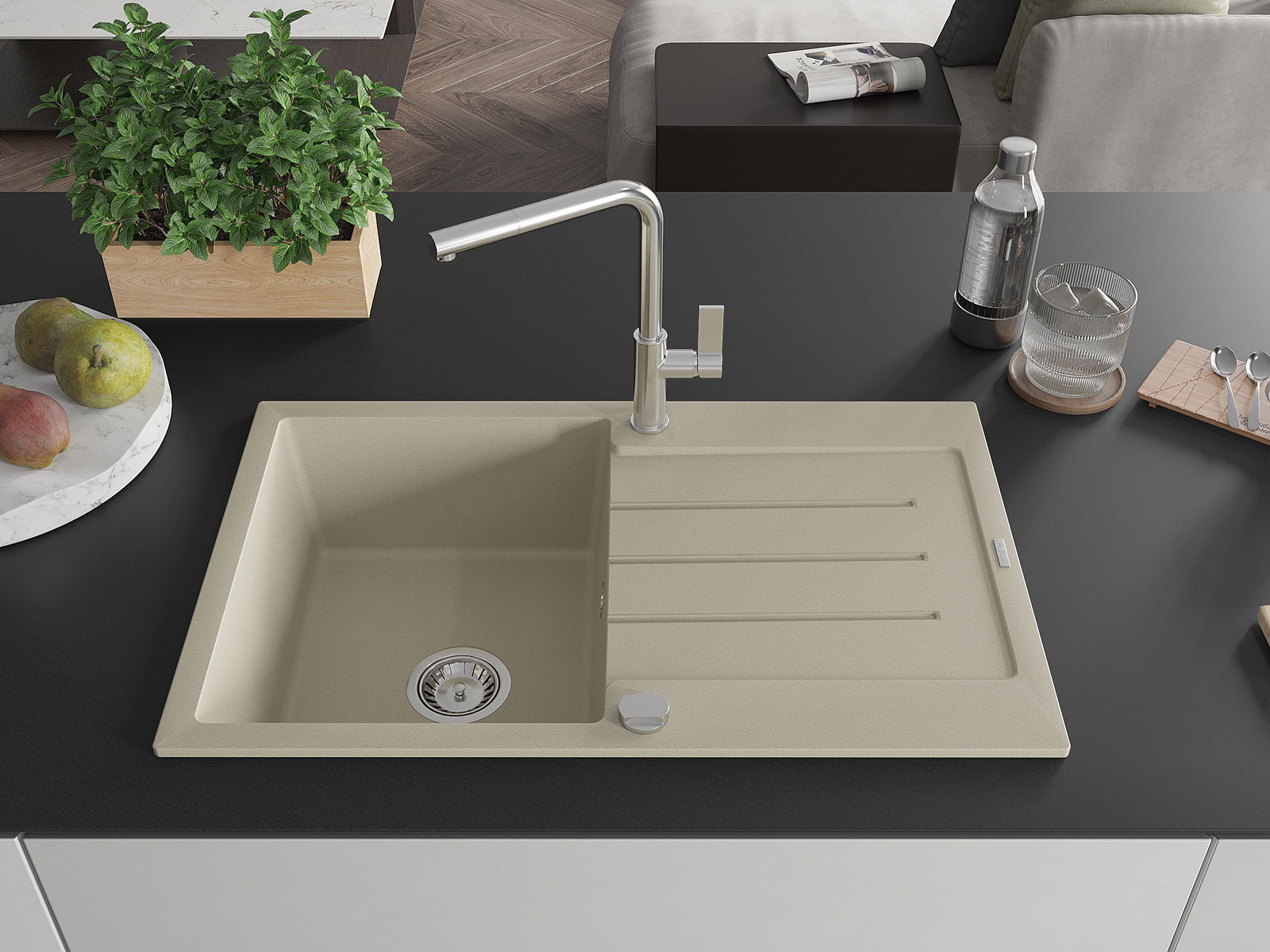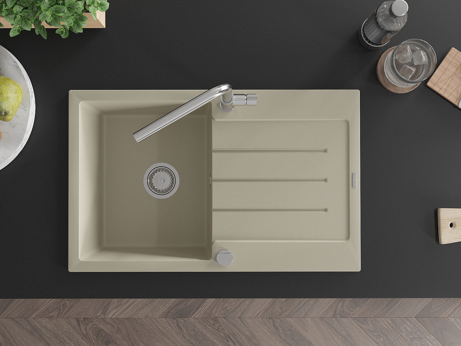Povrch umývadla je odolný voči škvrnám a sfarbeniu, vďaka čomu sa ľahko čistí a zachováva si svoju farbu po dlhú dobu. Estetický a prakticky dopĺňajúci každú kuchyňu.