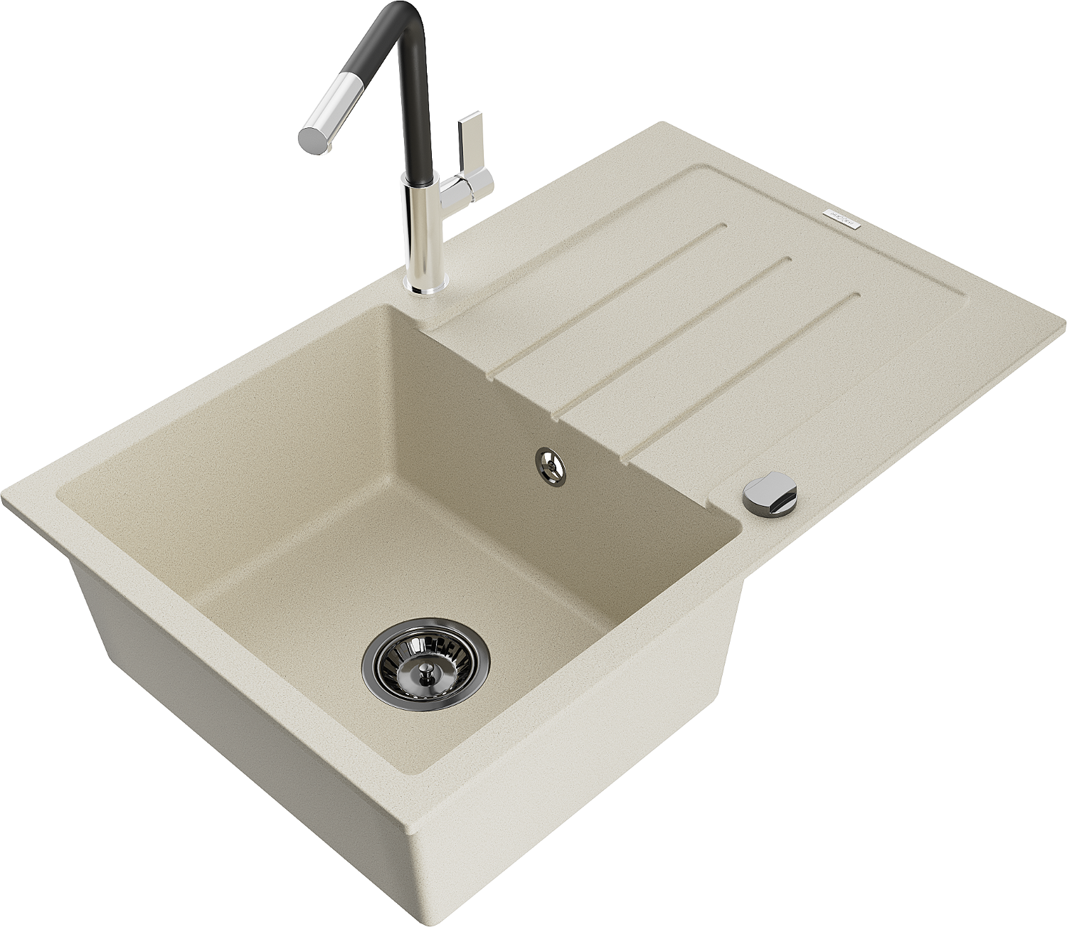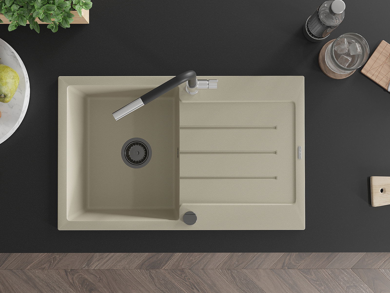 Mexen Bruno granitový drez 1-komorový s odkvapkávačom a kuchynskou batériou Flora, béžový - 6513-69-670401-07-B