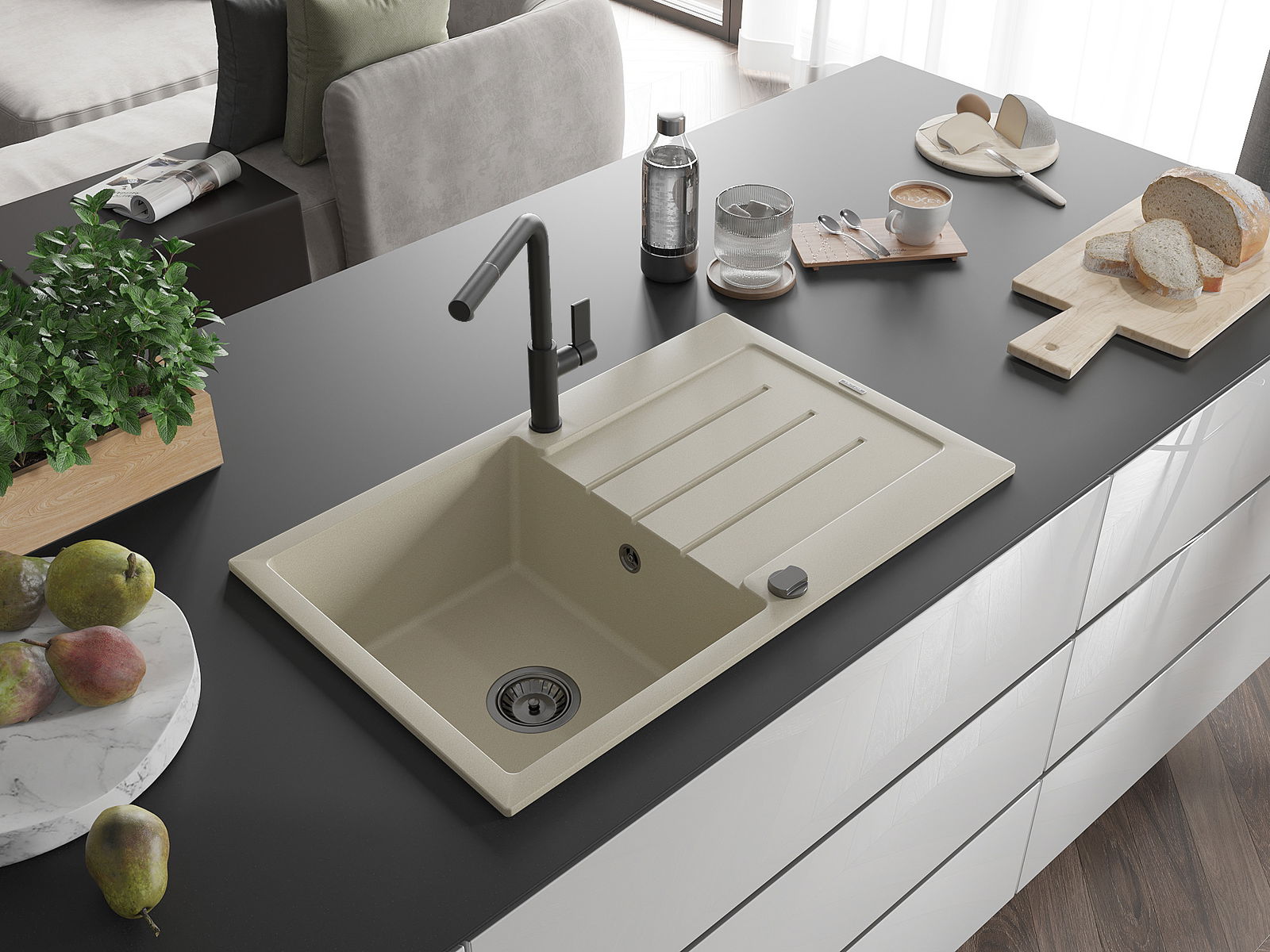Povrch umývadla je odolný voči škvrnám a sfarbeniu, vďaka čomu sa ľahko čistí a zachováva si svoju farbu po dlhú dobu. Estetický a prakticky dopĺňajúci každú kuchyňu.