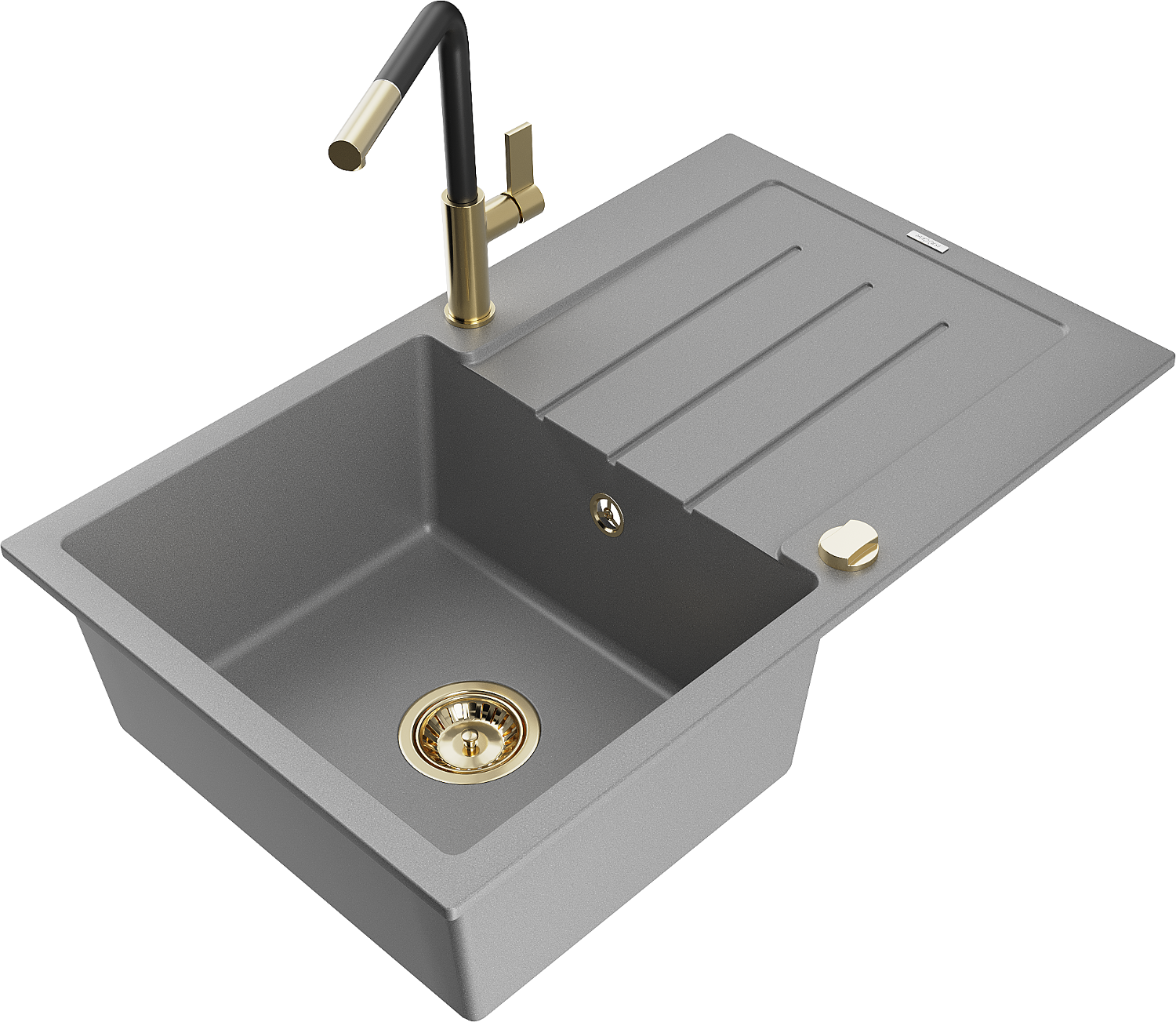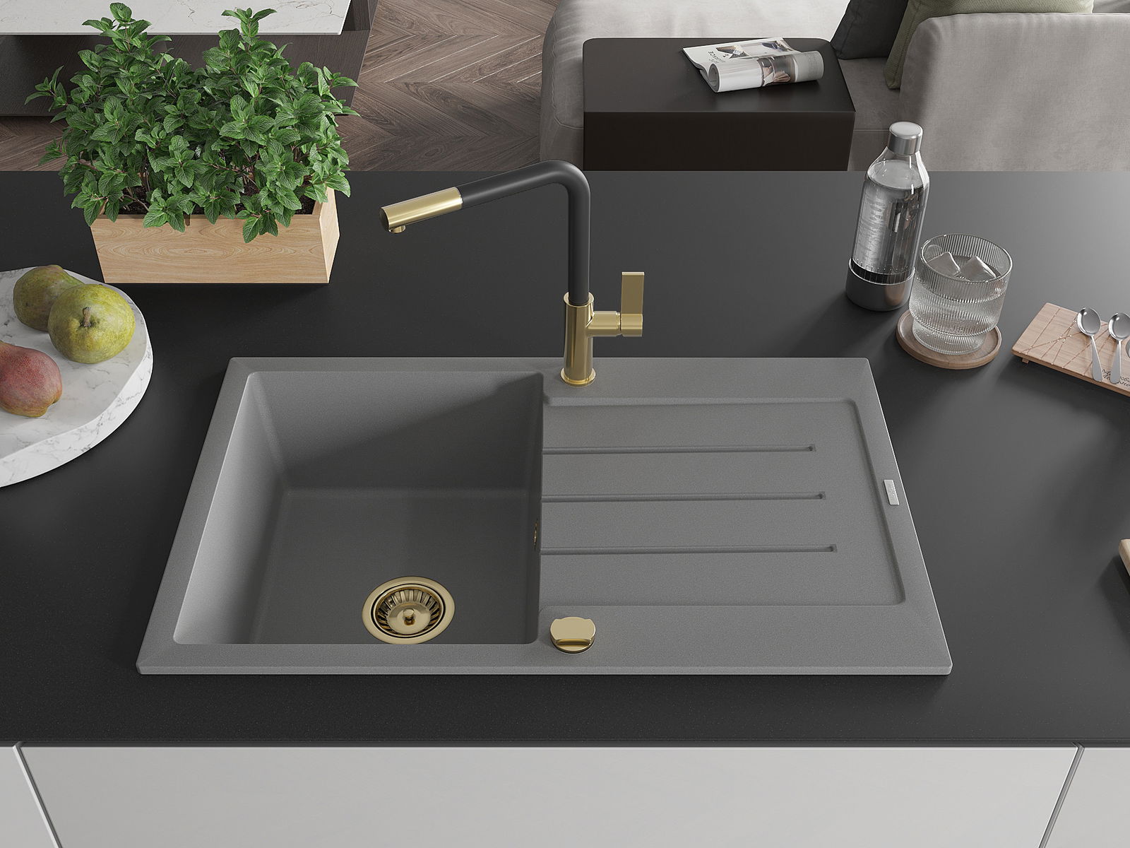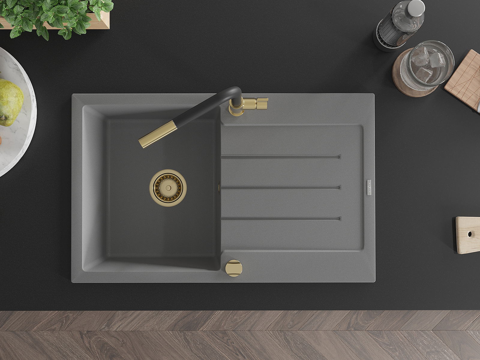 Mexen Bruno žulový kuchynský drez s 1 komorou a odkvapkávačom a kuchynskou batériou Flora, sivý - 6513-71-670401-57-G