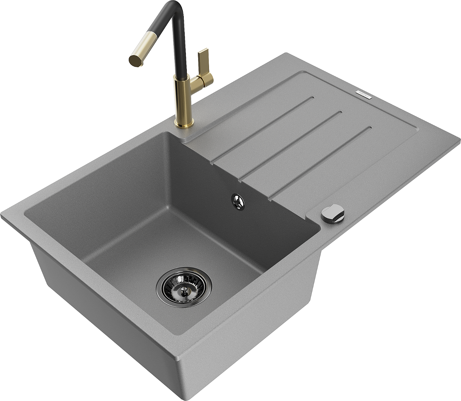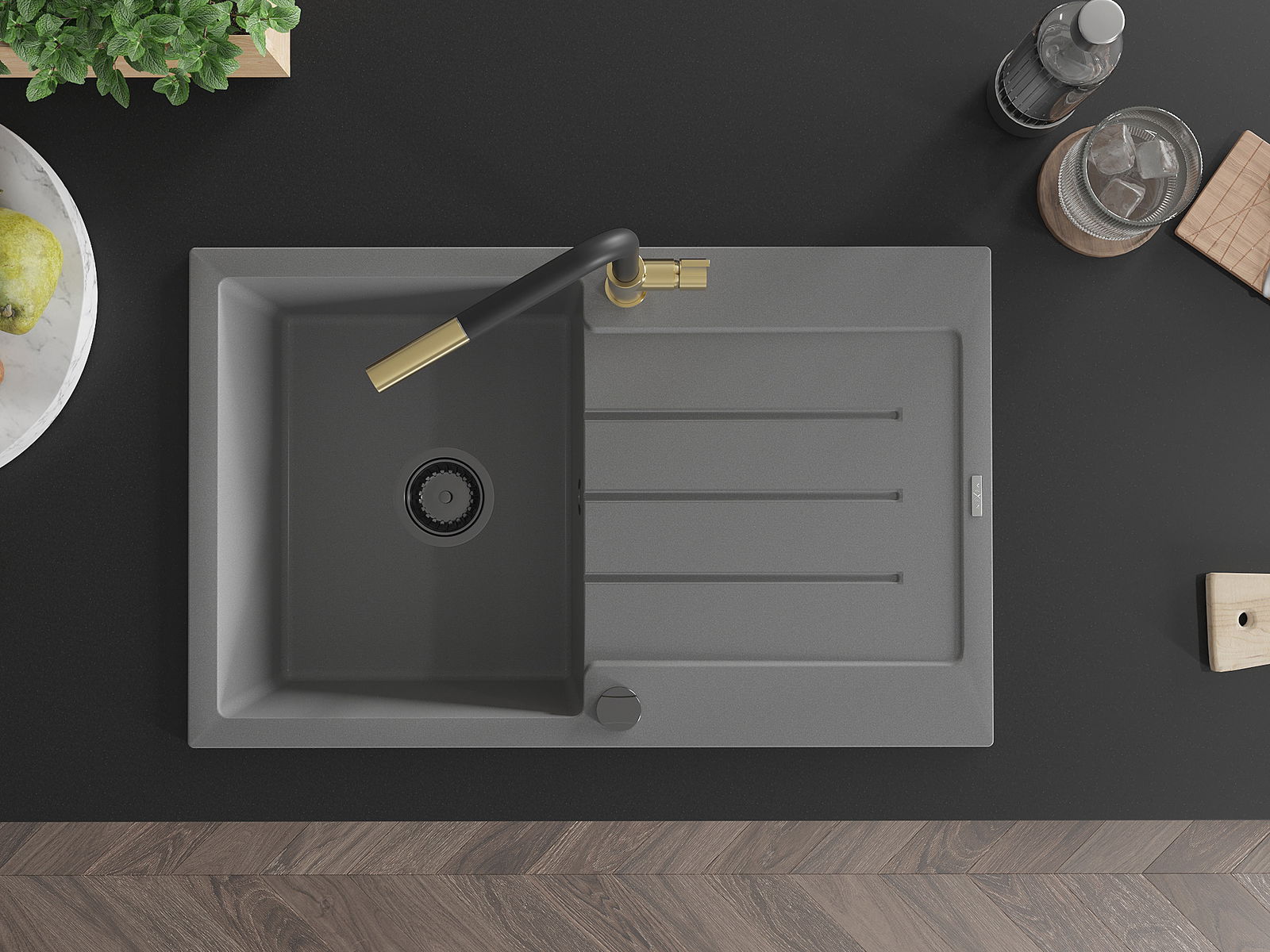 Mexen Bruno jednokomorový granitový drez s odkvapkávačom a kuchynskou batériou Flora, sivý - 6513-71-670401-57-B
