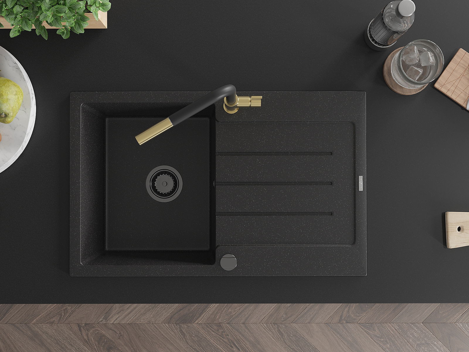 Mexen Bruno žulový drez s 1-komorou odkvapkávacou plochou a kuchynskou batériou Flora, čierny/strieborný metalíza