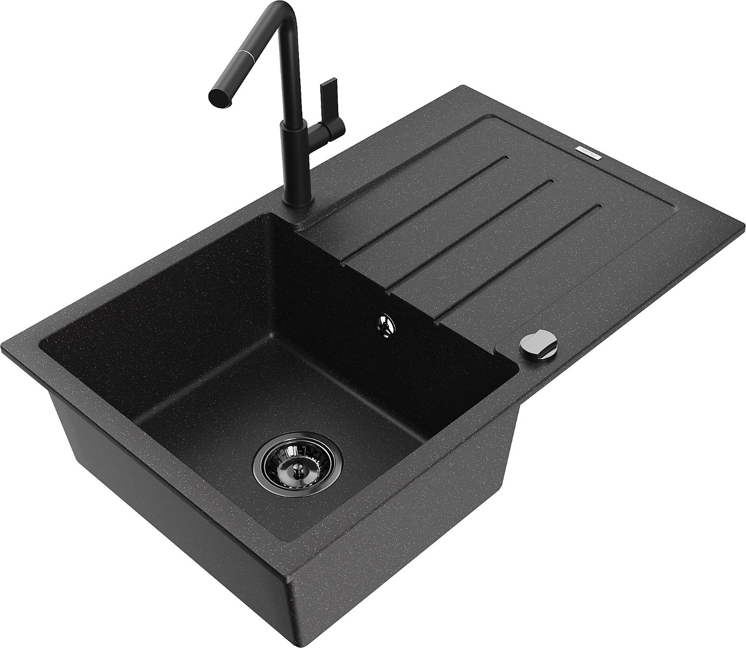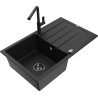Mexen Bruno žulový kuchynský drez s 1 komorou s odkapávačom a kuchynskou batériou Flora, čierny/strieborný metalický