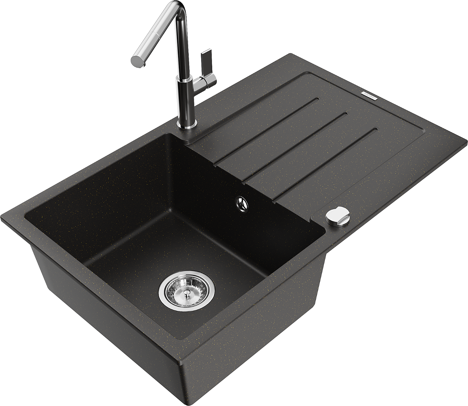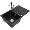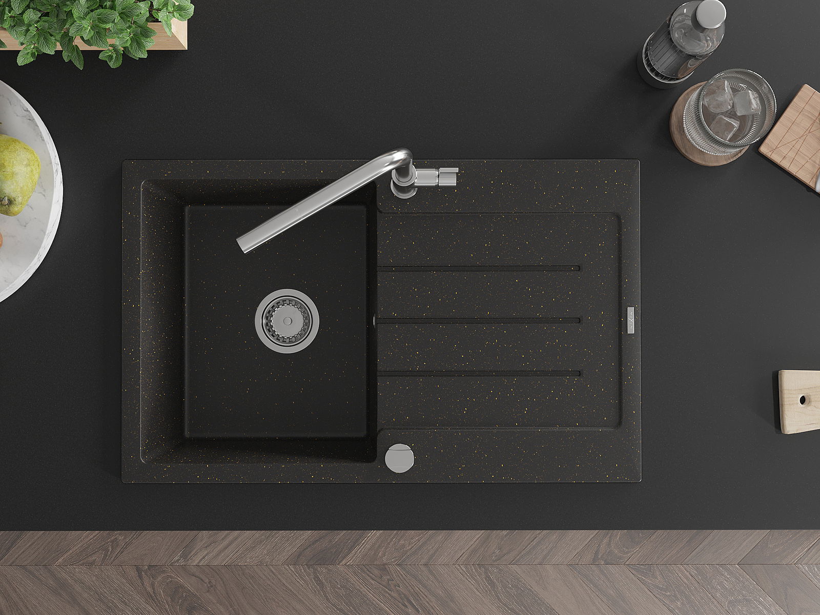 Mexen Bruno granitový jednodrez s odkvapkávačom a kuchynskou batériou Flora, čierny/zlatý metalický - 6513-75-670401-00