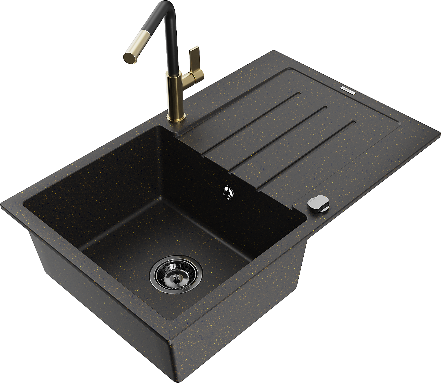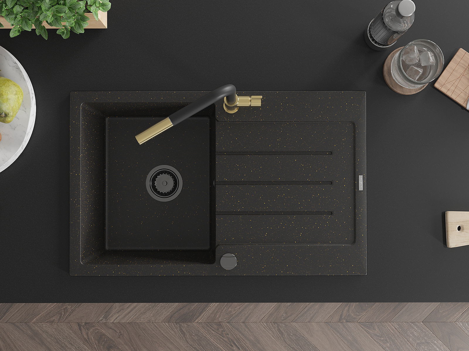 Mexen Bruno granitový drez s 1 komorou s odkvapkávačom a kuchynskou batériou Flora, čierny/zlatý metalický