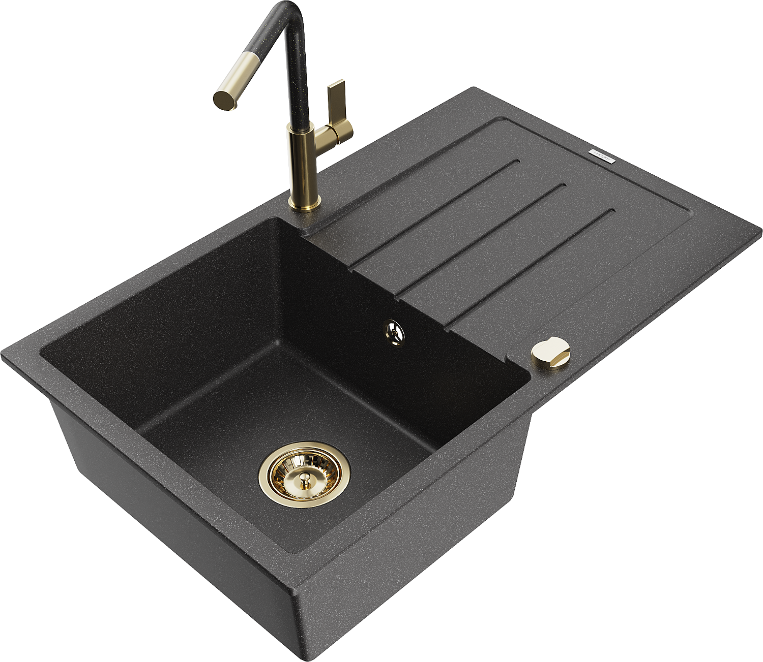 Mexen Bruno granitový drez 1-komorový s odkladacou plochou a kuchynskou batériou Flora, čierno škvrnitý - 6513-76-670401-75-G