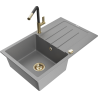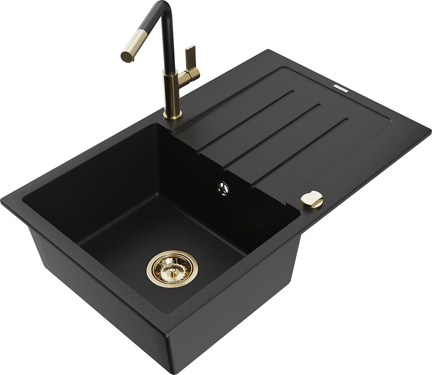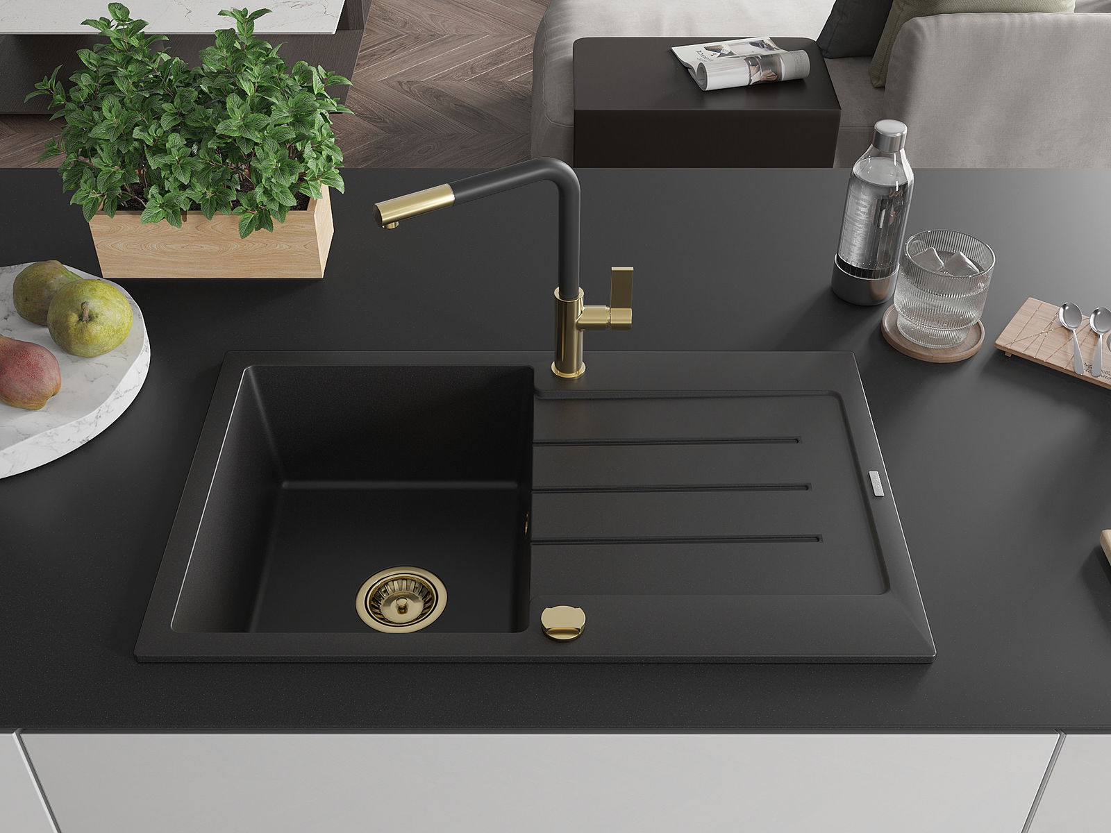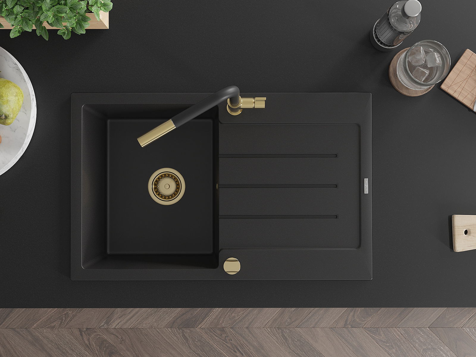 Mexen Bruno žulový kuchynský drez 1-komorový s odkvapkávačom a kuchynskou batériou Flora, čierny - 6513-77-670401-57-G