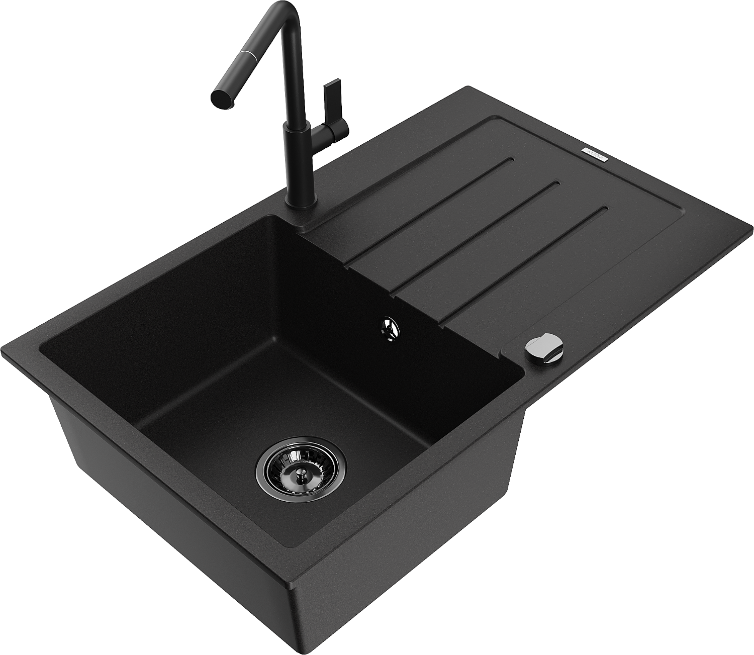 Mexen Bruno žulový drez s 1 komorou a odkvapkávacou plochou a kuchynskou batériou Flora, čierny - 6513-77-670401-70-B