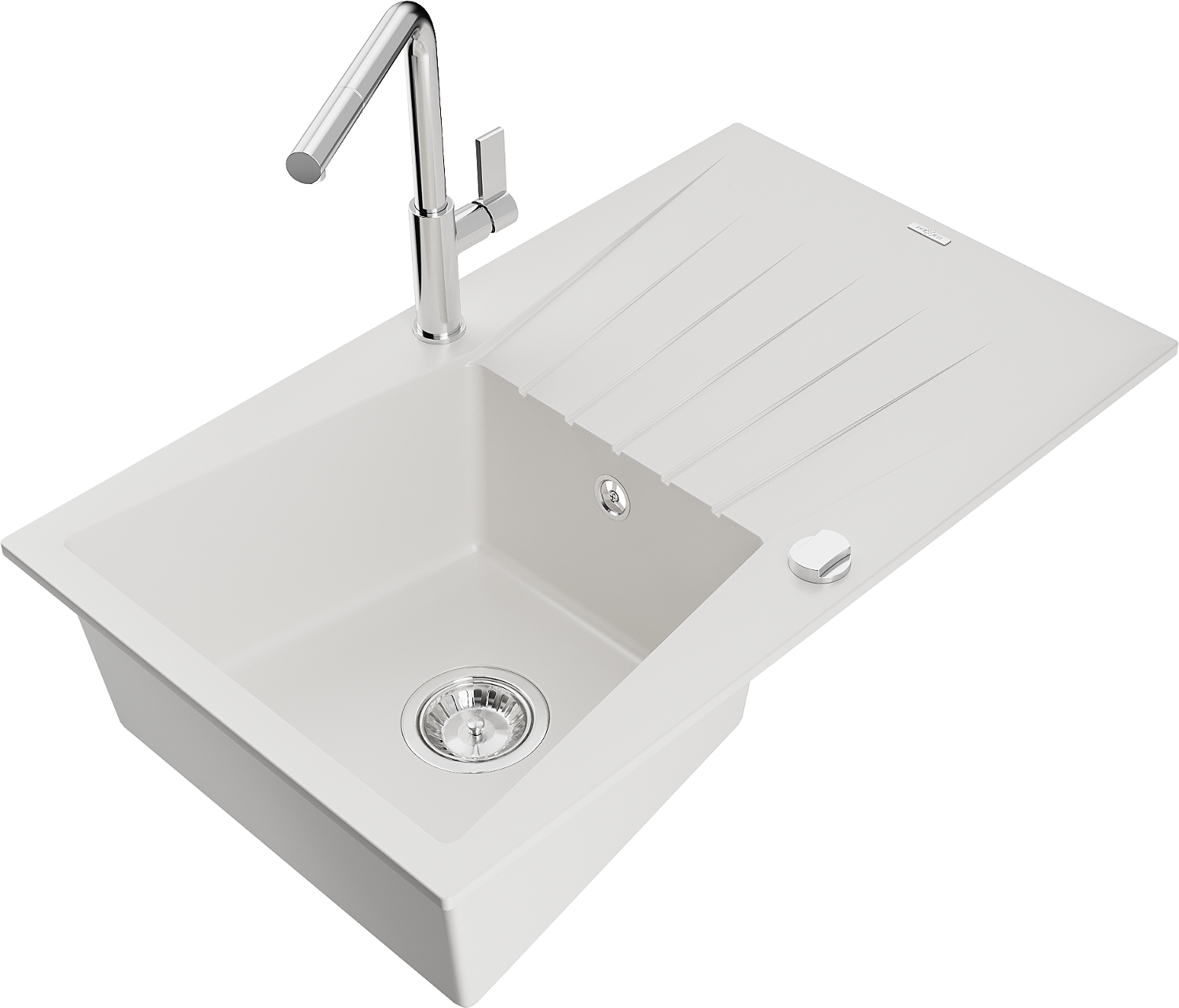 Mexen Cesar granitový kuchynský drez 1-komorový s odkvapkávačom a kuchynskou batériou Flora, biely - 6514-20-670401-00