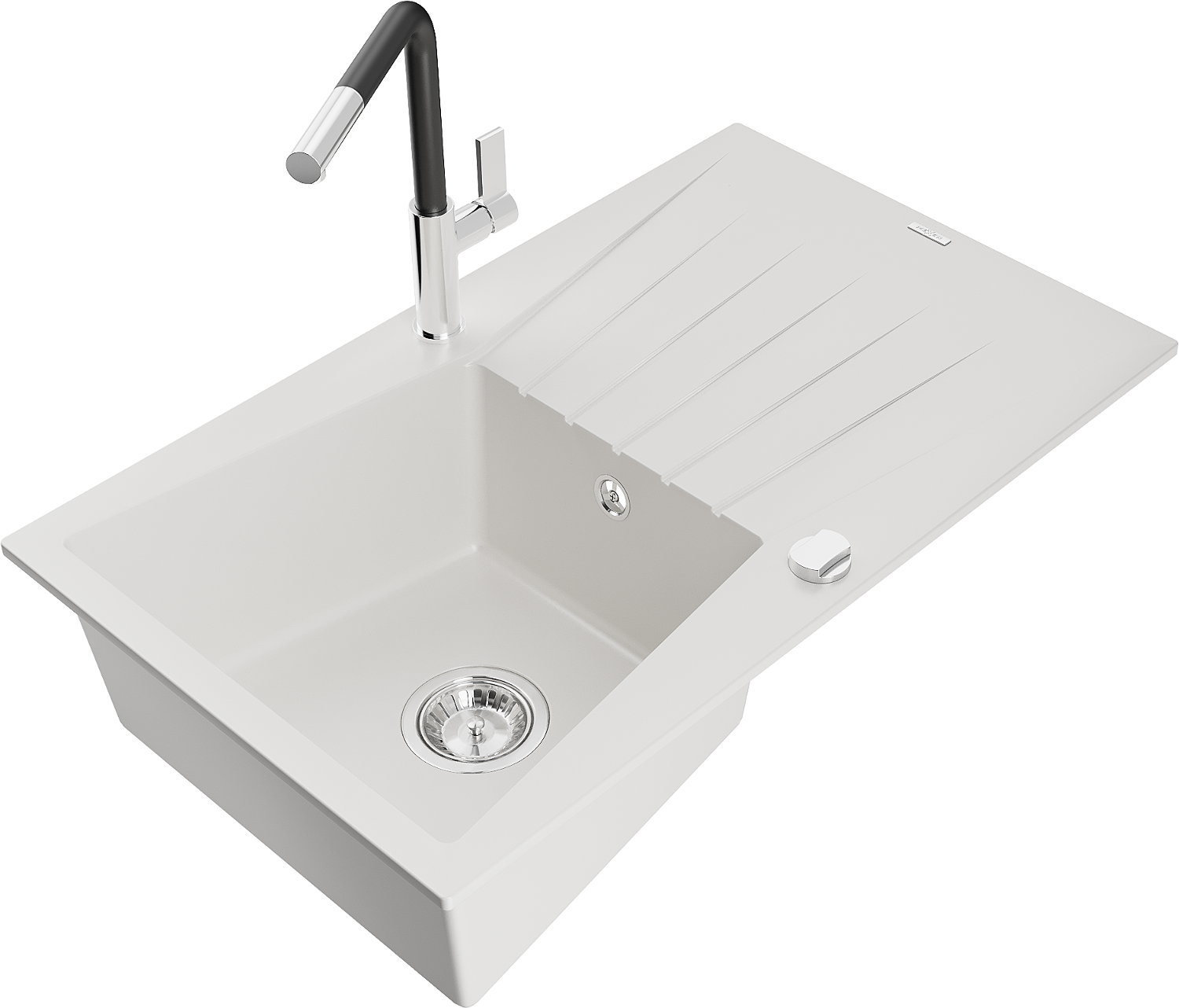 Mexen Cesar granitový drez 1-komorový s odkvapkávačom a kuchynskou batériou Flora, biely - 6514-20-670401-07