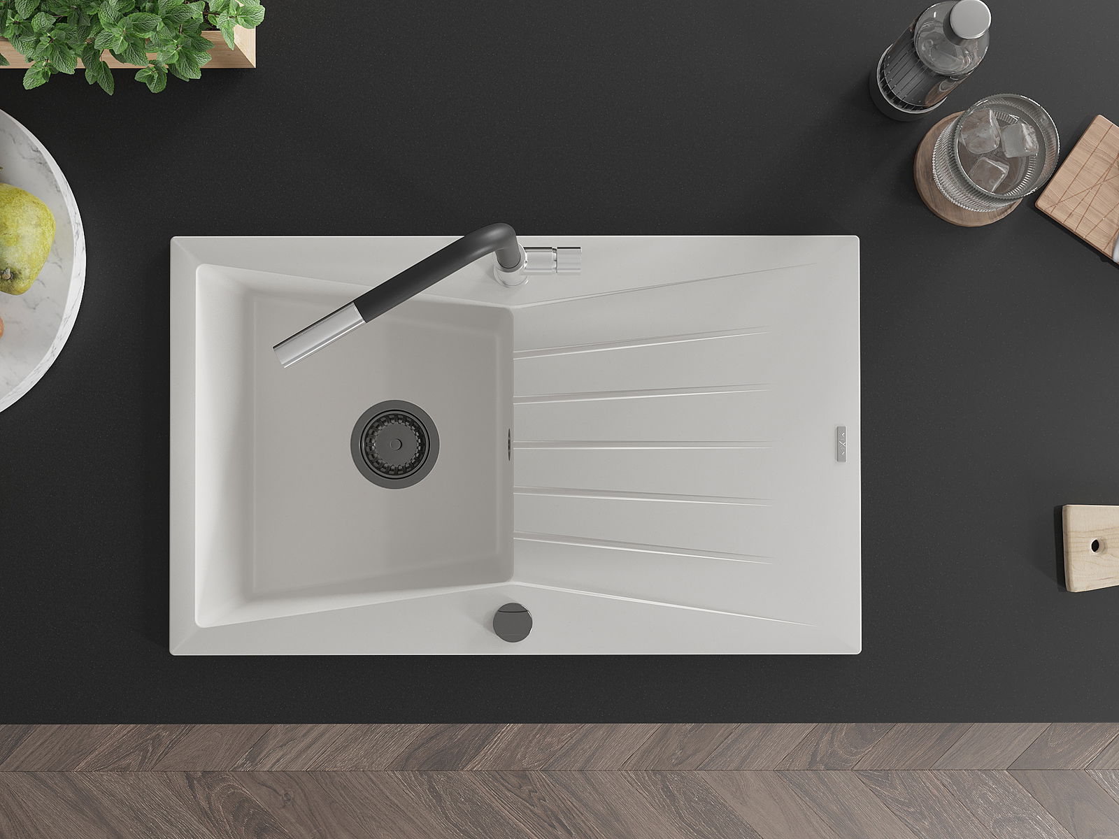 Mexen Cesar granitový drez 1-komorový s odkvapkávačom a kuchynskou batériou Flora, biely - 6514-20-670401-07-B