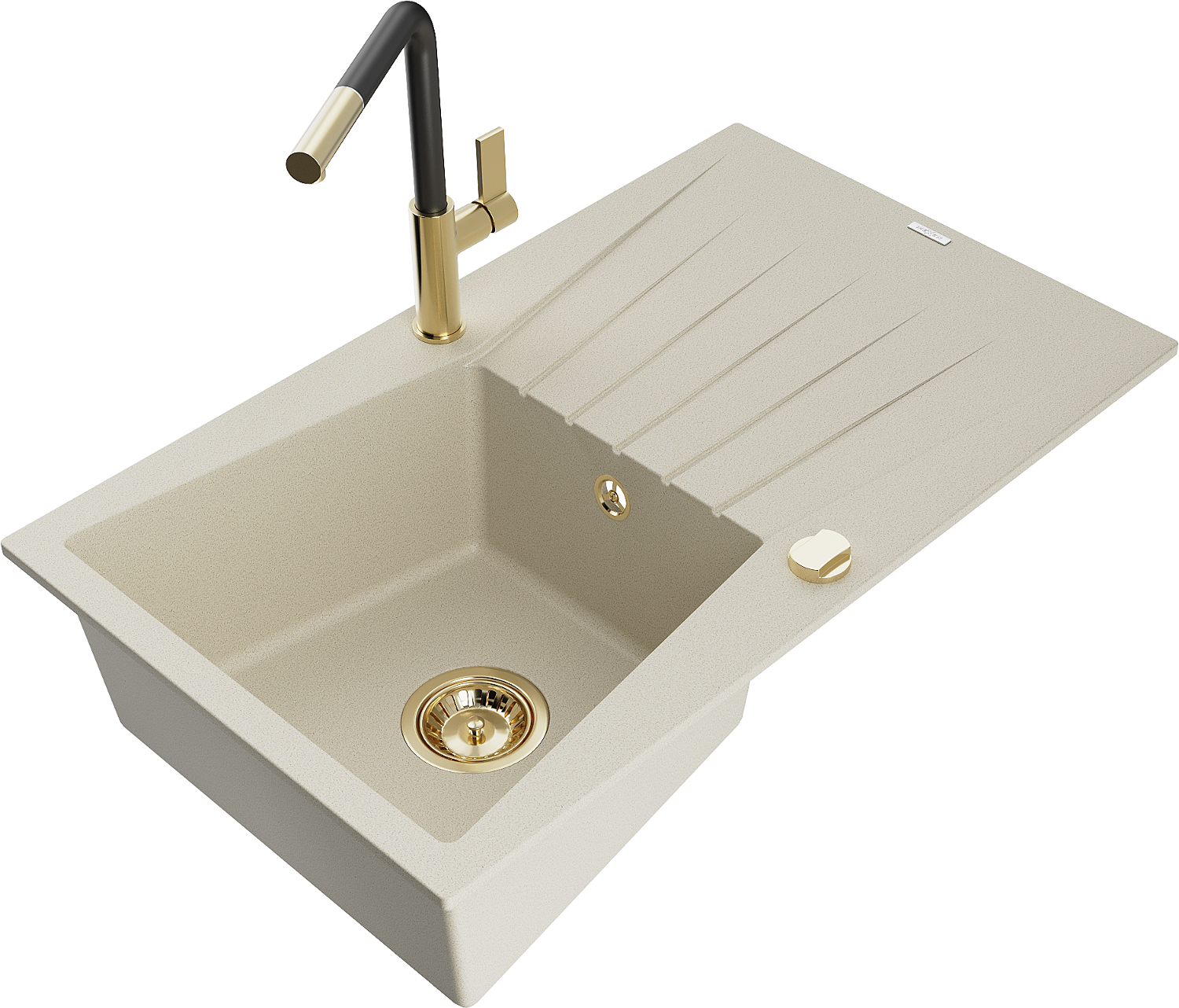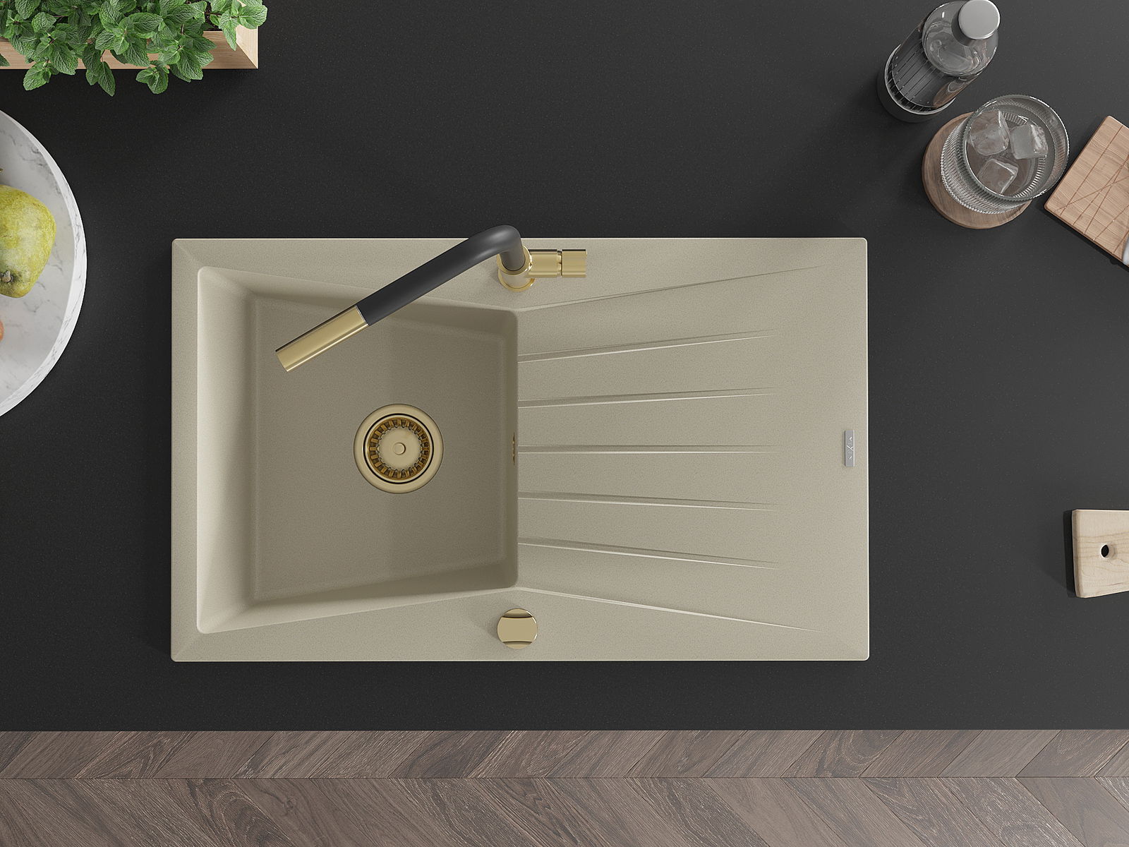Mexen Cesar granitový drez 1-komorový s odkvapkávačom a kuchynskou batériou Flora, béžový - 6514-69-670401-57-G