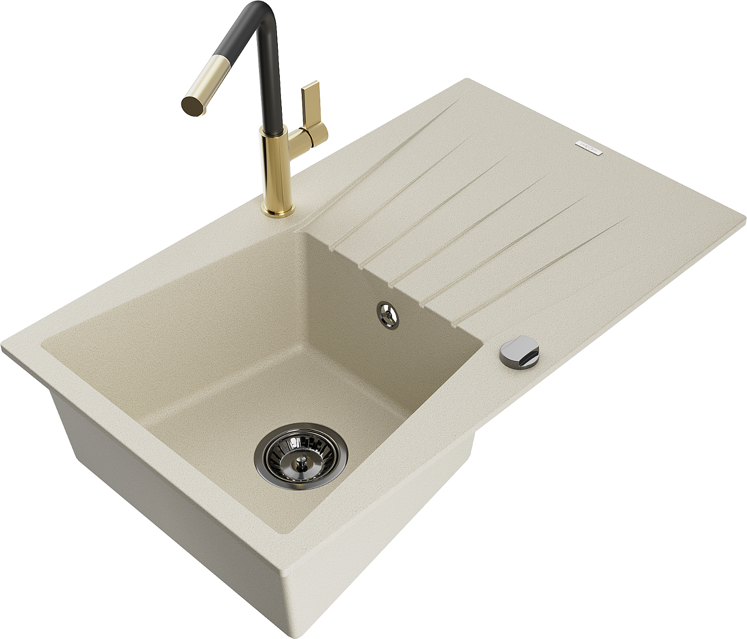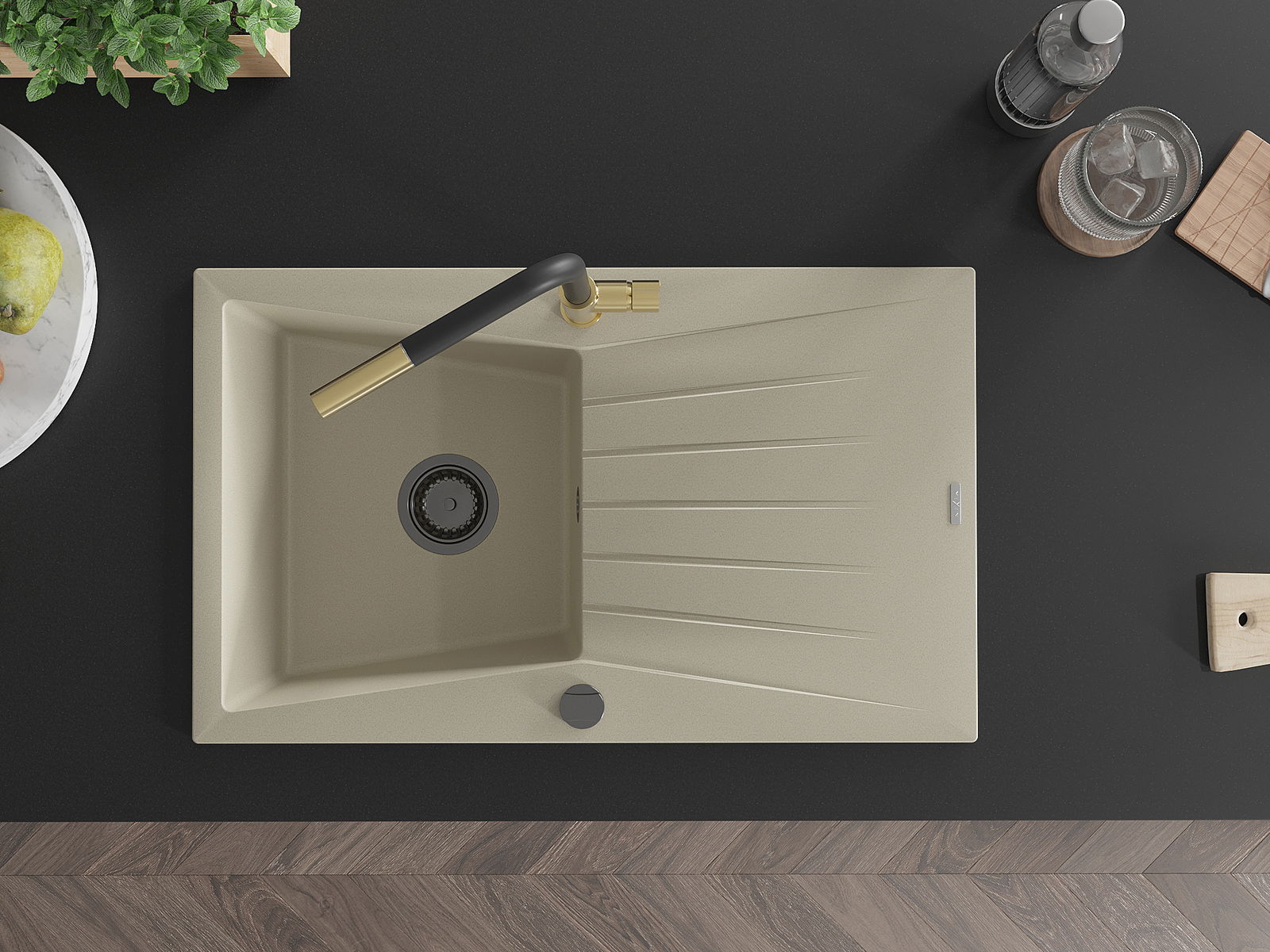 Mexen Cesar granitový drez 1-komorový s odkvapkávacou plochou a kuchynskou batériou Flora, béžový - 6514-69-670401-57-B