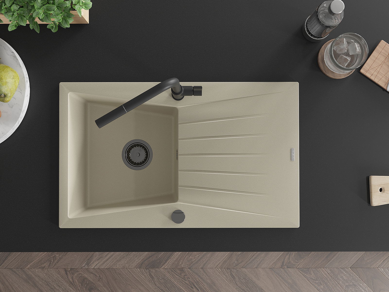 Mexen Cesar žulový drez 1-komorový s odkvapkávačom a kuchynskou batériou Flora, béžový - 6514-69-670401-70-B