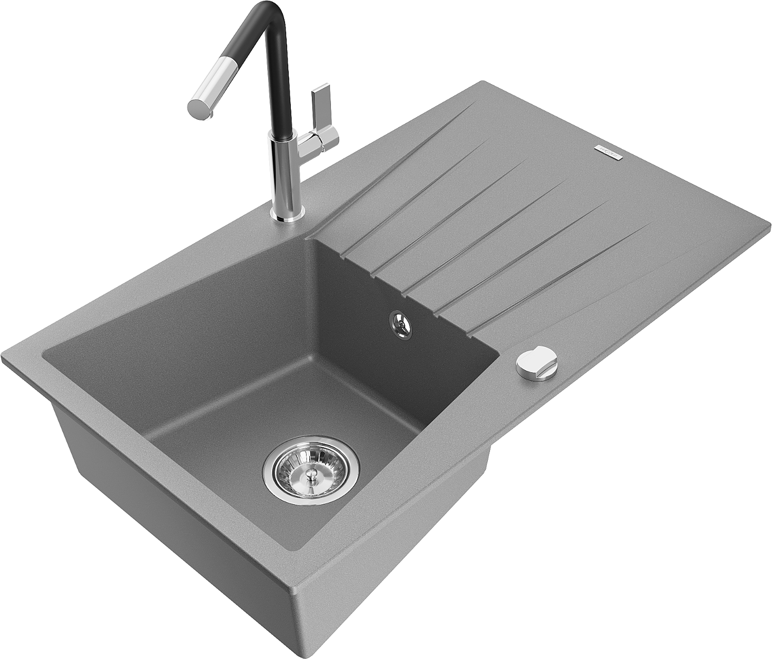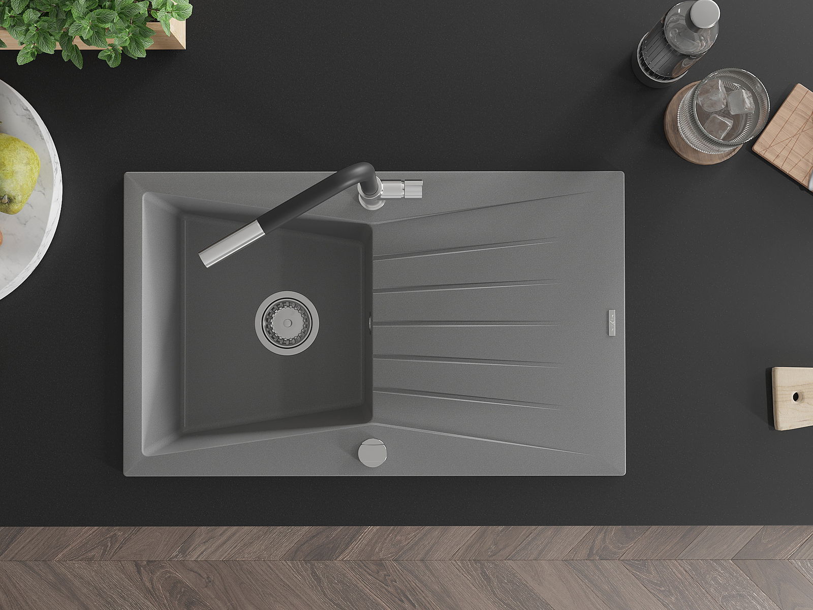 Mexen Cesar žulový drez 1-komorový s odkvapkávačom a kuchynskou batériou Flora, sivý - 6514-71-670401-07