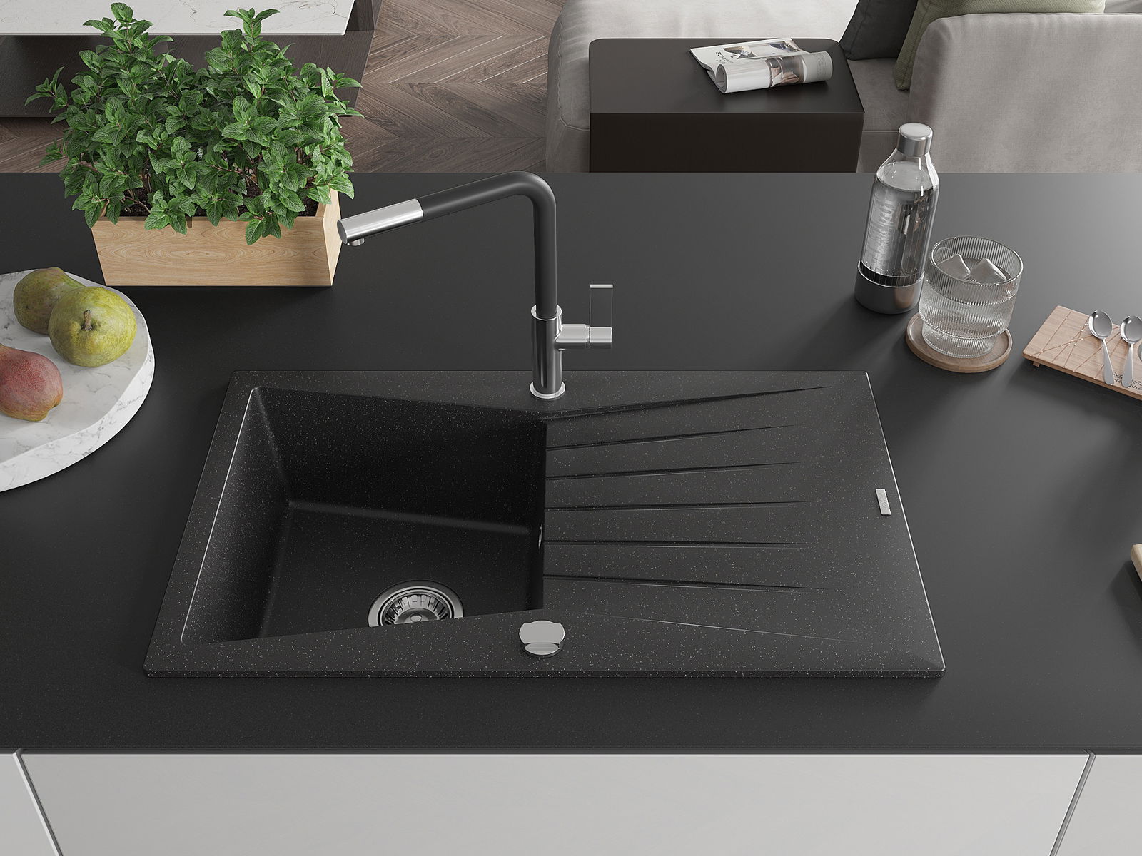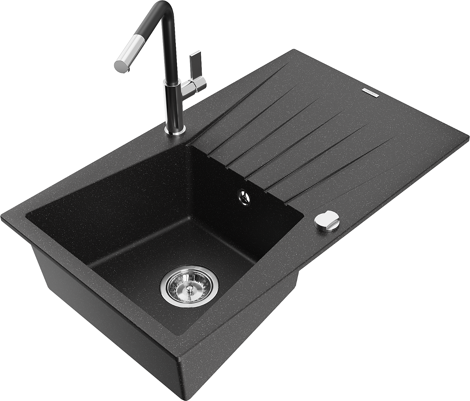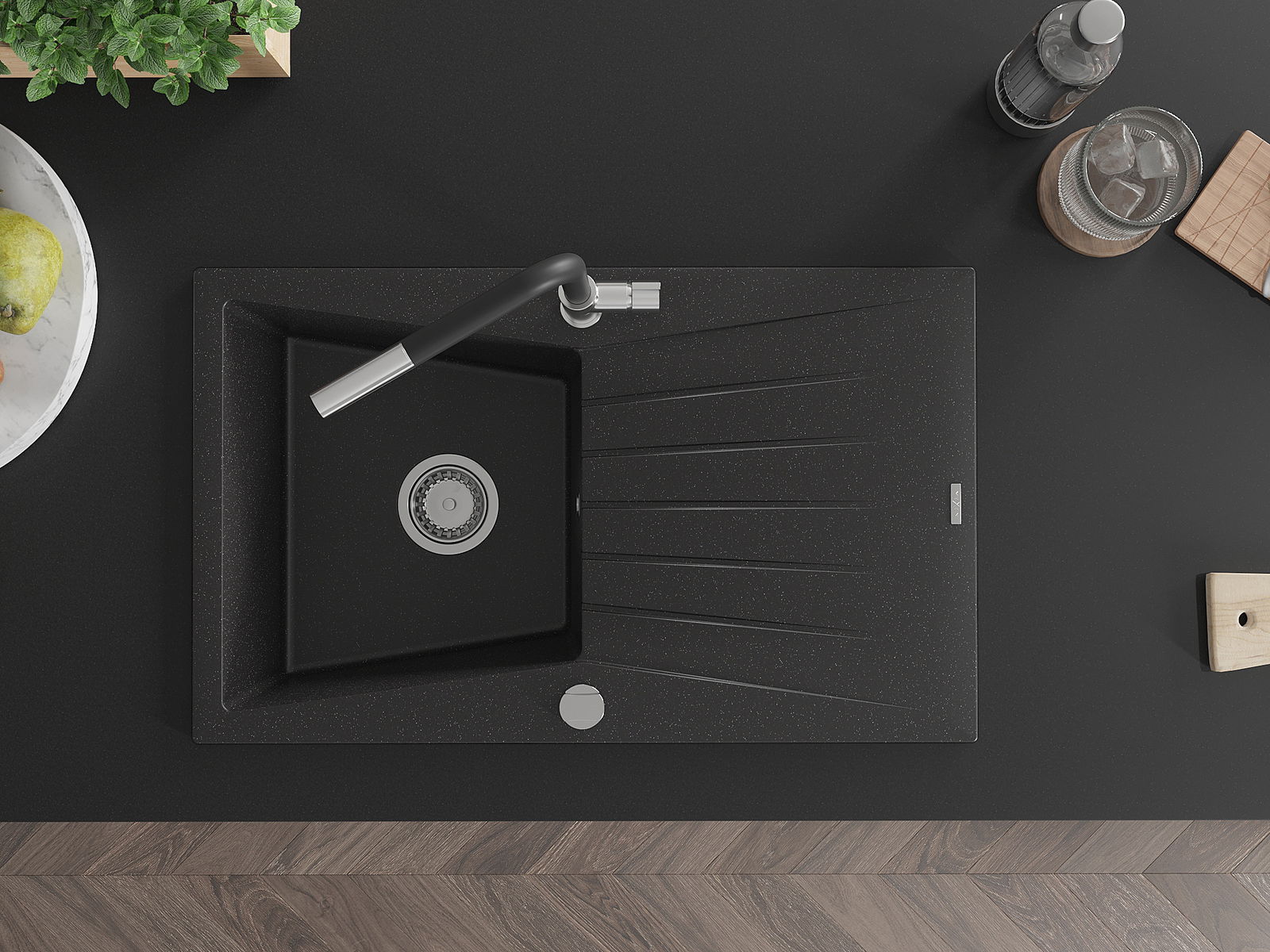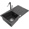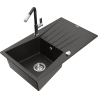Mexen Cesar granitový drez s jednou komorou s odkvapkávačom a kuchynskou batériou Flora, čierny/strieborný metalik