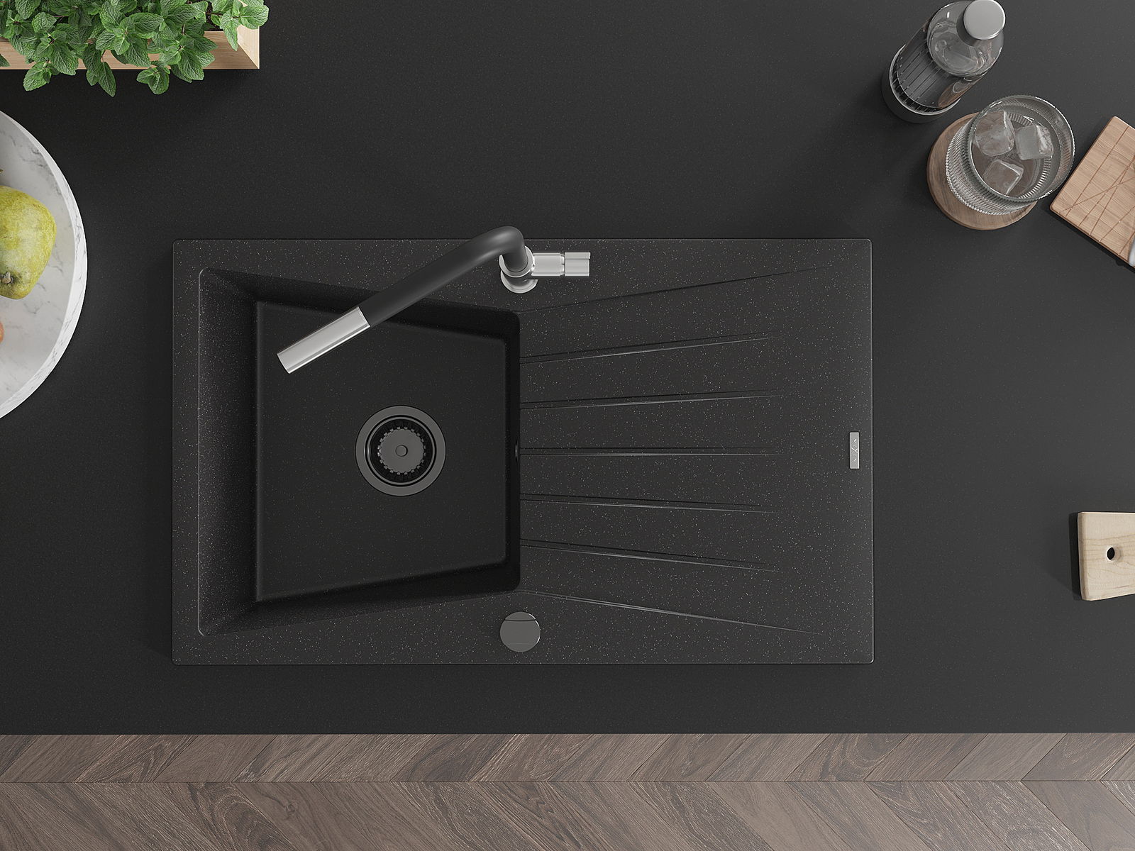 Mexen Cesar žulový drez s 1 komorou s odkvapkávačom a kuchynskou batériou Flora, čierny/strieborný metalik - 6514-73-670401-07-?